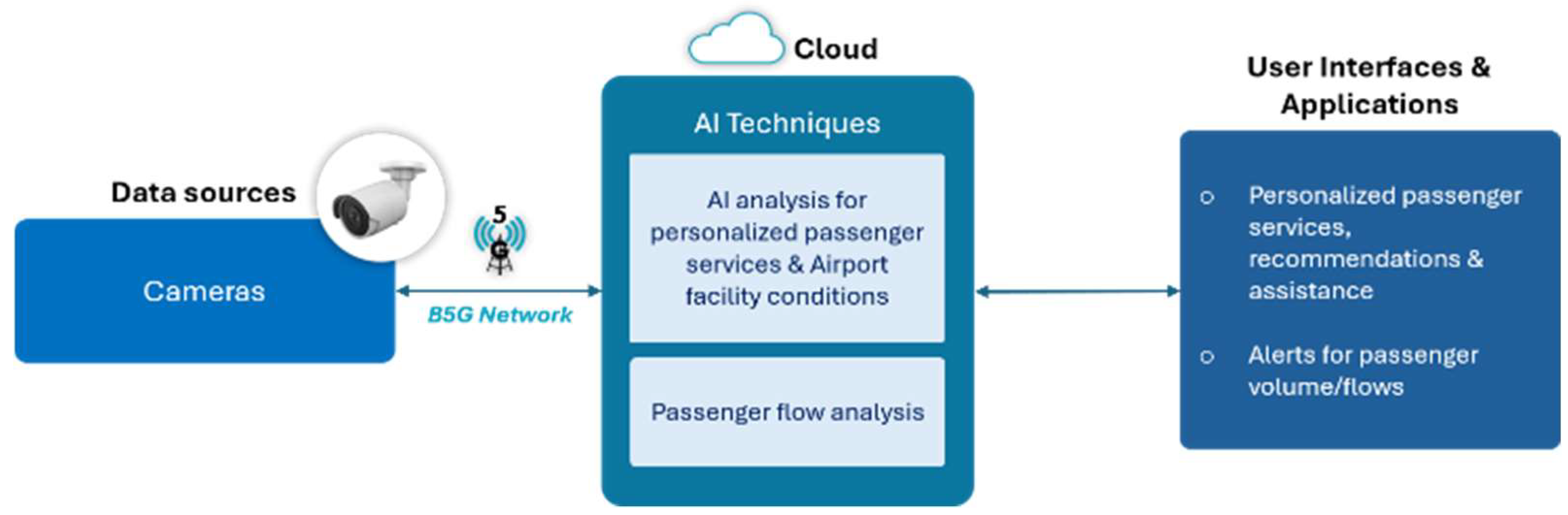5G/B5G wireless networks provide the critical infrastructure foundation enabling real-time communication between distributed sensors, robotic systems, and centralized management platforms [9]. The ultra-low latency, high bandwidth, and massive connectivity capabilities of 5G networks support the stringent performance requirements of human–robot interaction, real-time video analytics, and mission-critical airport operations [10]. Private 5G deployments offer enhanced security and reliability compared to traditional wireless infrastructure, making them particularly suitable for aviation environments [11].