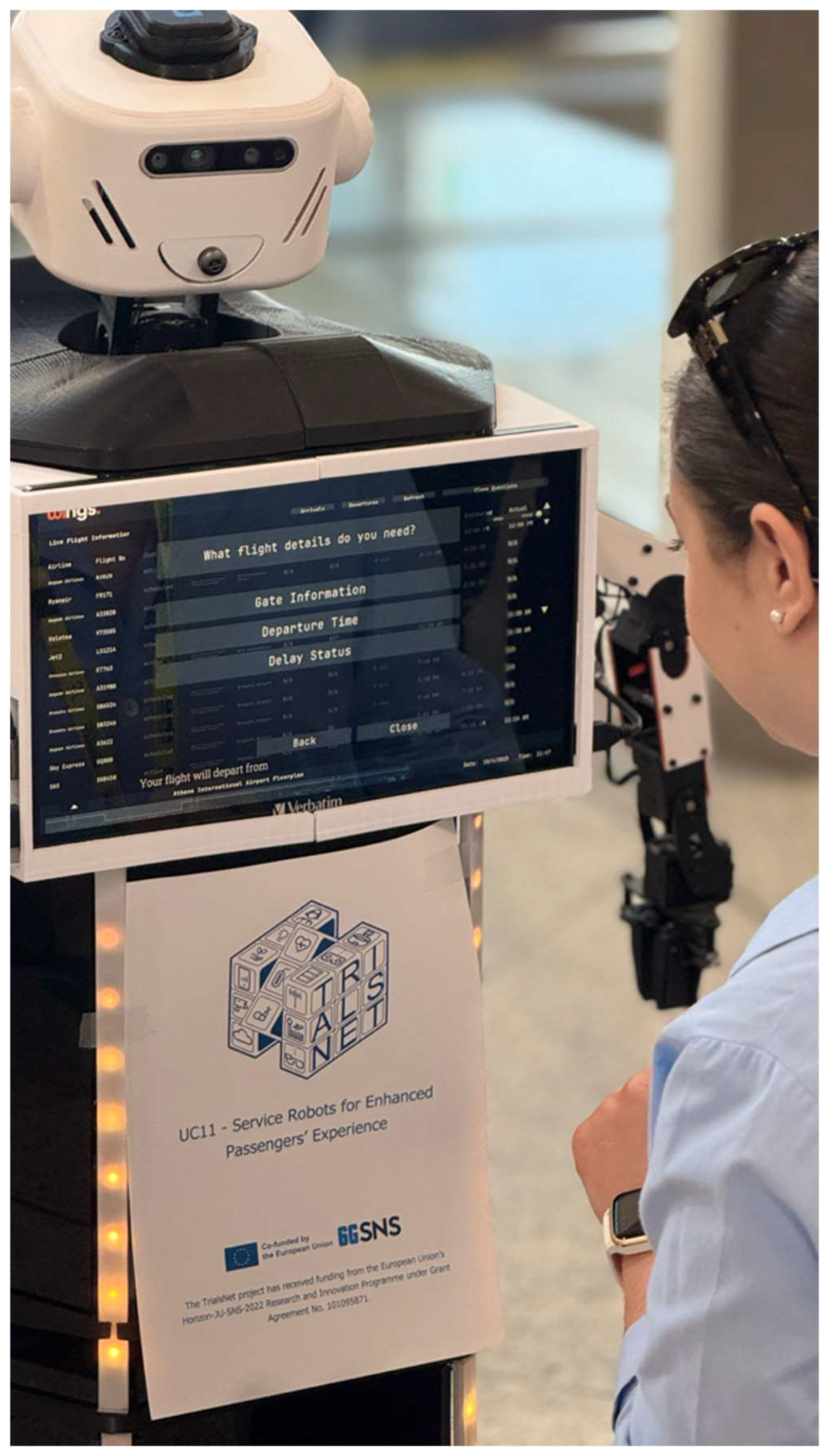 The UC11 experimental validation was conducted on 10 April 2025, at Athens International Airport, specifically at Entrance 1 in the Departures section. This high-traffic location was strategically selected for its continuous passenger flow, providing authentic real-world conditions to assess the performance of AI-powered service robots in enhancing passenger experience and supporting airport operations.