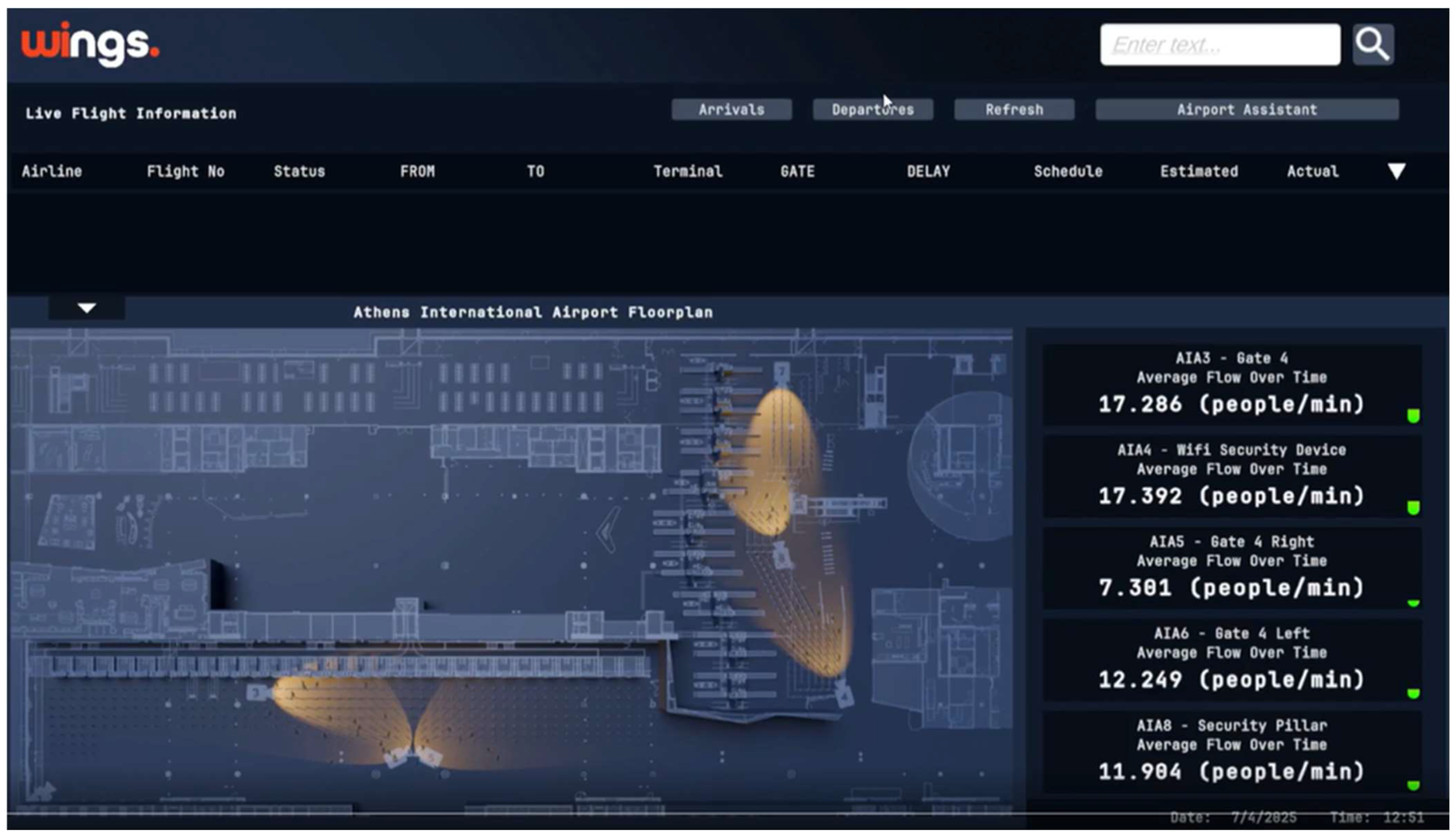 The wi.move web dashboard (Figure 3) offers Terminal Operations Supervisors a unified interface that displays (a) Interactive maps showing camera and robot locations, (b) Live video overlays with passenger detections bounding boxes, (c) Graphs of key metrics (people count, average wait time, speed, flow rate, queue throughput and queuing time), and (d) Alert notifications for congestion or anomalies. Robots host a multilingual user application that retrieves flight schedules, gate assignments via a 3rd party, and real-time congestion data directly from wi.move, delivering travel assistance through text-to-speech and natural language interfaces.