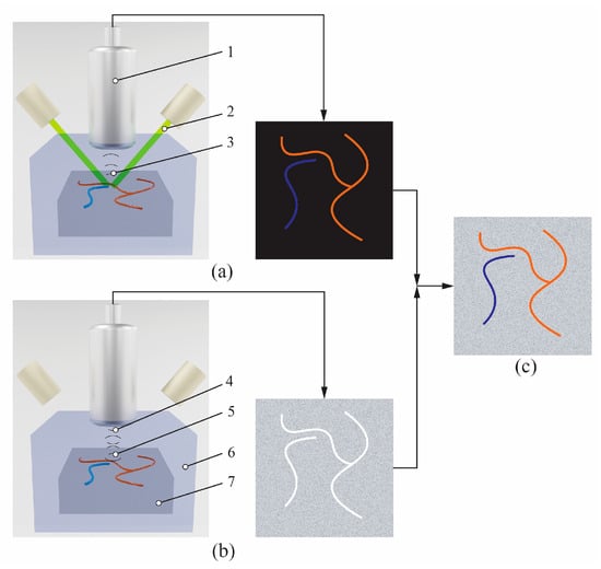 PAUS principle: (a) PA image, (b) US image, (c) overlaid PAUS image. 1—US transducer, 2—laser beam, 3—US waves generated by the PA effect, 4—US waves emitted from the transducer, 5—reflected US waves, 6—US propagation environment, 7—tissue sample.