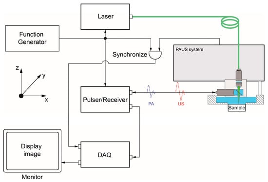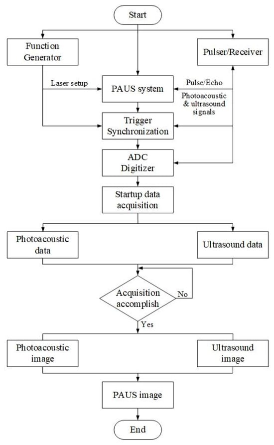 Figure 2 shows the flowchart of PAUS signal processing that uses a DAQ system to collect data and generate an image using image algorithm reconstruction. A function generator is used to create a trigger pulse for a short-pulsed laser that is connected to the PAUS probe and trigger synchronization. In US mode, a P/R is implemented to send an electric signal to the US transducer, thereby emitting US waves to the sample. Both PA and US signals are gathered by the same P/R that is connected to an analog–digital converter (ADC) digitizer. The trigger signals from the function generator and the P/R are synchronized with the encoder of the PAUS scanning system, allowing data acquisition at each lateral scanning position. Data collection is initiated simultaneously with probe scanning, and the PA and US signals are sequentially stored as separate datasets according to their time-of-flight responses until the acquisition is completed. The PA and US images are reconstructed using algorithms such as time domain, delay and sum, and time reversal [87,88,89,90]. Finally, the PAUS image is generated by co-registering and fusing the reconstructed PA and US images.