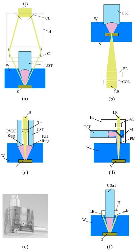 Schematic of PAUS probes: (a) reflection type, (b) transmission type, (c) customized US transducer type, (d) diagonal reflection type, (e) 3D-rendered design of diagonal reflection type, (f) US array transducer type. AL: aspheric lens, C: condenser, CL: conical lens, COL: correction lens, FL: focusing lens, H: housing part, LB: laser beam, M: mirror, PM: polyethylene membrane, S: sample, USaT: US array transducer, UST: US transducer, W: water.