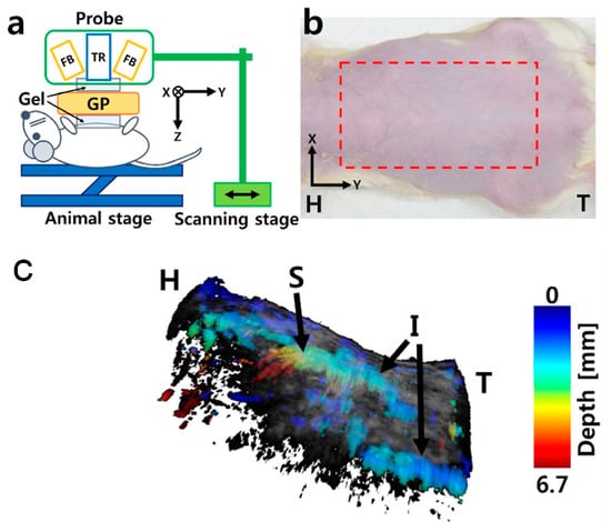 PAUS system using the motion stage: (a) schematic of the PAUS system, (b) photograph of the rat and ROI (the red dashed rectangle), (c) depth-resolved volumetric PAUS image of the rat. H: head, I: intestine, S: stomach, T: tail, FB: fiber bundle, TR: US array transducer, GP: gelatin pad [104].