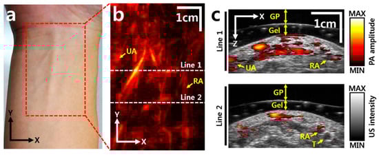 In vivo images of a human forearm: (a) photograph of a human right forearm, (b) PA image, (c) cross-sectional overlaid PAUS images at the two white dashed lines in (b). UA: ulnar artery, RA: radial artery, T: tendon, Gel: gelatin, GP: gelatin pad [104].