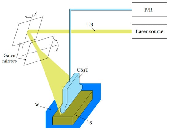 In the PAUS application, the galvo system is implemented to steer the laser beam [128,129]. Figure 11 shows the schematic of the PAUS system using the galvo mechanism. The laser beam is propagated to the mirror, which is adjusted through its angular movement to scan the ROI. In this version, the PAUS probe developed based on a US linear array transducer is used to receive the PA signal produced at a high frame rate. Using the galvo PAUS system, an ROI of 28 mm × 28 mm has been successfully imaged at 30 fps [128]. The advantages of the galvo mechanism include low inertial mass and the absence of mechanical contact between moving components, which make it particularly suitable for high-speed and high-precision imaging applications with enhanced durability and reliability. However, there are some limitations that need to be addressed in future studies. First, achievable ROI is relatively small and difficult to expand due to the limited angular range of the mirror. Second, the mirror steers the laser beam to various axial depths, resulting in misalignment between laser and ultrasound, which affects image quality. Third, the captured images must be reconstructed to correct the distortions caused by the scanning patterns, which necessitates the optimization of the image processing algorithm, particularly in real-time scanning process.