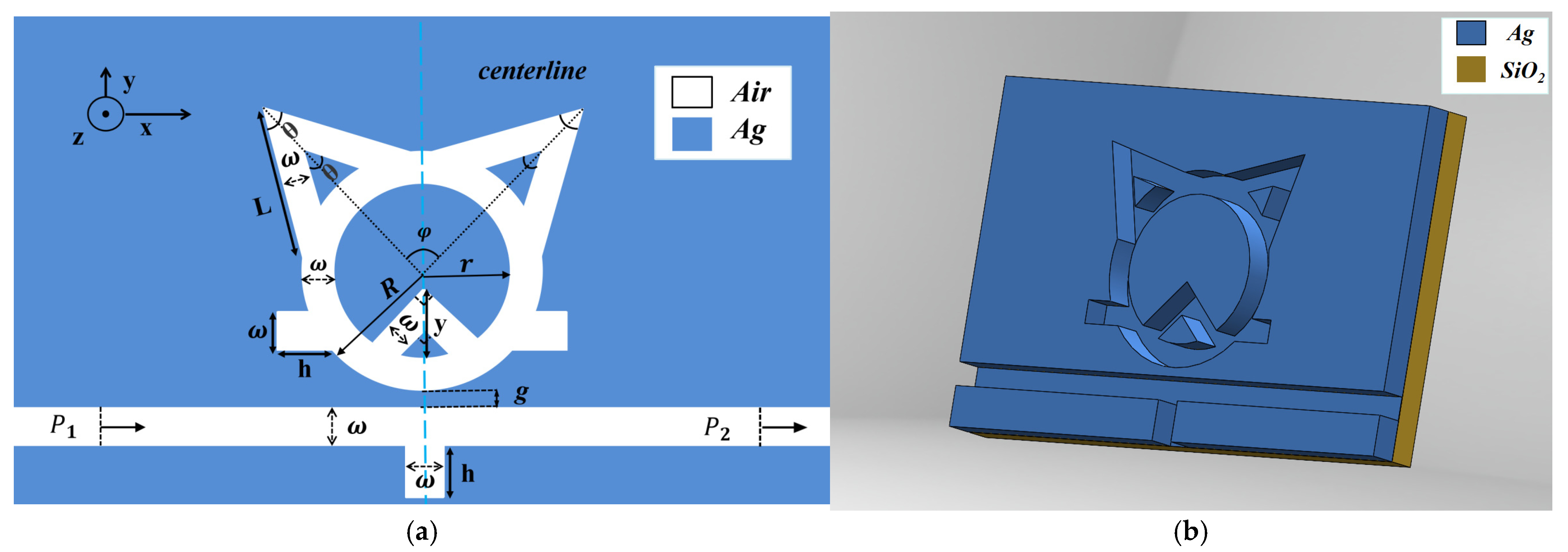 Figure 1b better illustrates the 3D structural features, where a quartz substrate is utilized. Silver was selected as the metallic material in this study primarily due to its exceptional electromagnetic properties and excellent chemical stability. On the one hand, silver exhibits a low imaginary part of its dielectric constant, manifesting as exceptionally low ohmic losses, which is conducive to achieving strong electromagnetic field localization and enhancement. On the other hand, the inherent high chemical stability and corrosion resistance of silver ensure the long-term reliability of the device in complex environments, which is crucial for maintaining the stability of the plasmonic resonance effects. This distinctive amalgamation of properties renders silver an optimal choice for the development of advanced plasmonic devices.