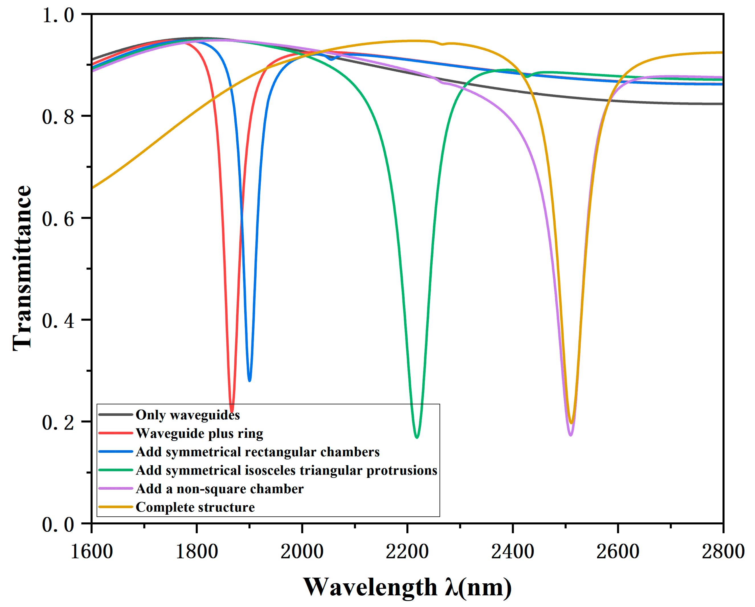 To elucidate the origin of the Fano resonance, simulations were conducted for individual components and intermediate structures: the standalone MIM waveguide, the structure with symmetric isosceles triangular protrusions, the structure with symmetric rectangular cavities, the structure with a non-square cavity, and the final complete configuration. The corresponding transmission spectra are illustrated in