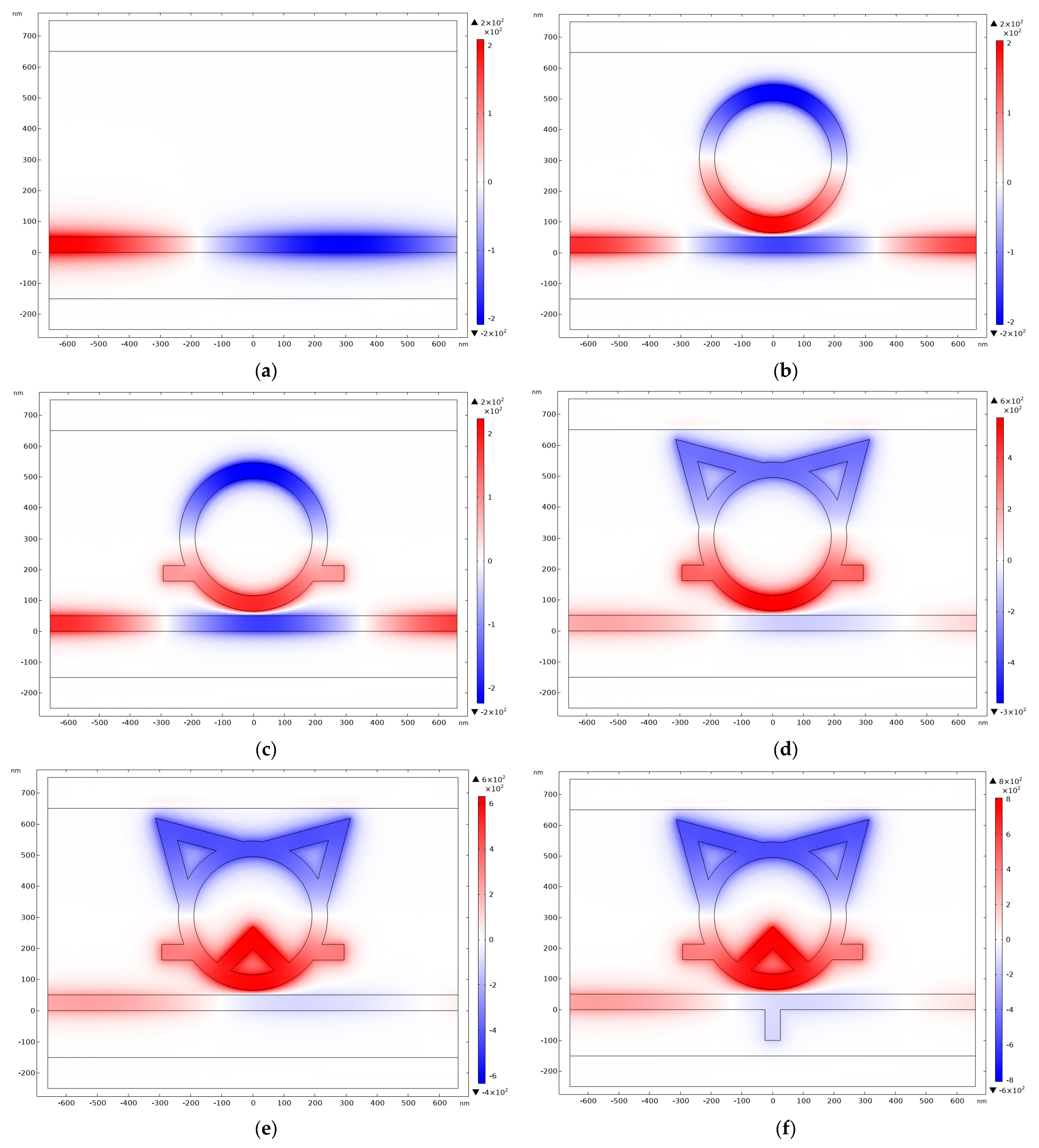 Figure 1b, respectively. The key geometric parameters are articulated as follows: R denotes the outer radius of the larger ring, r represents its inner radius, and ω indicates the width of the MIM waveguide. Additionally, the structure includes two symmetric equilateral triangular cavities, three rectangular cavities, and an isosceles right-angled triangular cavity, while h signifies the height of the three rectangular cavities. θ is the vertex angle of the symmetric equilateral triangular cavities (set to 60°), φ is the angle between the central axes of the two symmetric triangular cavities relative to the ring center, y is the leg length of the external isosceles right-angled triangle, and L represents the side length of the external equilateral triangles, while g denotes the coupling distance between the waveguide and the TCRSW structure. The width ω is conventionally established at 50 nm to enable the transmission of only the fundamental transverse magnetic mode.