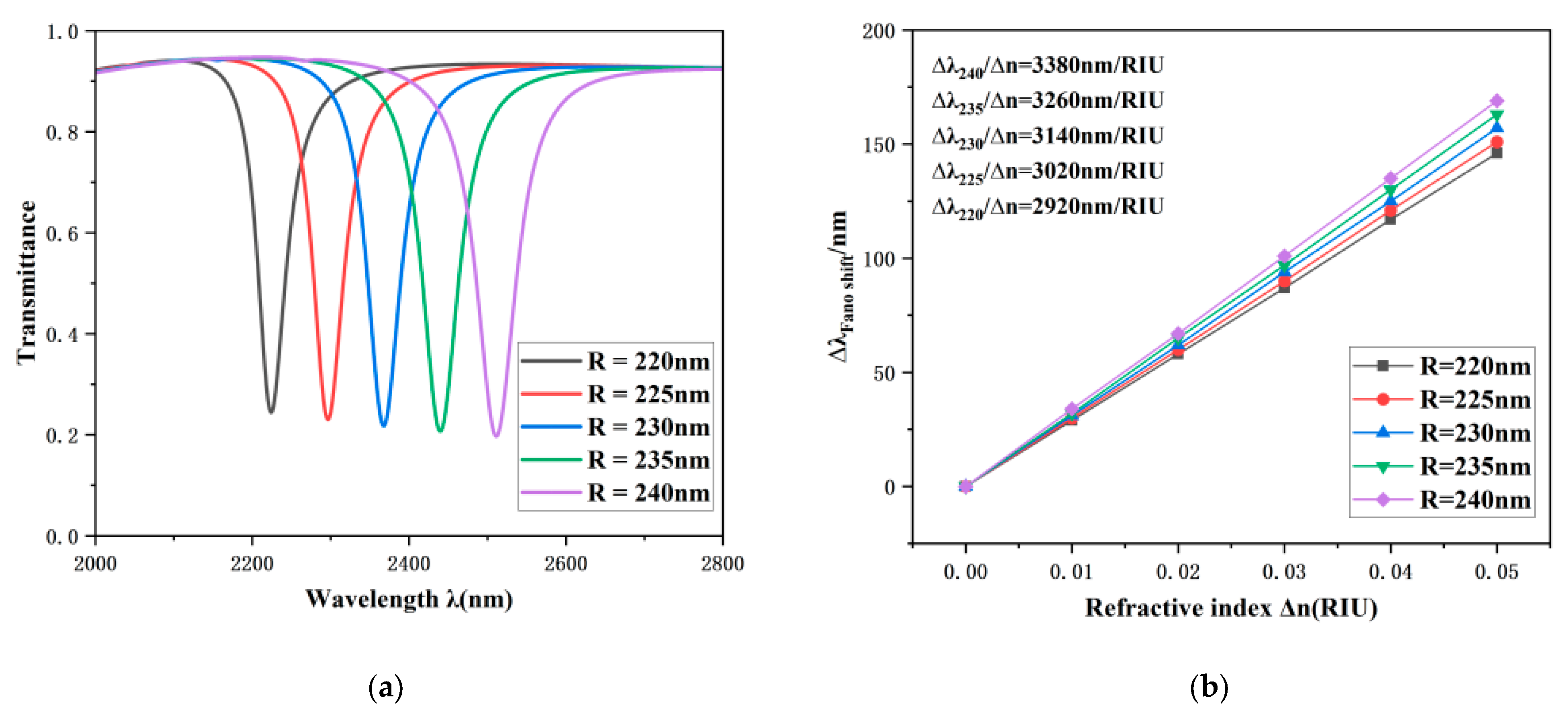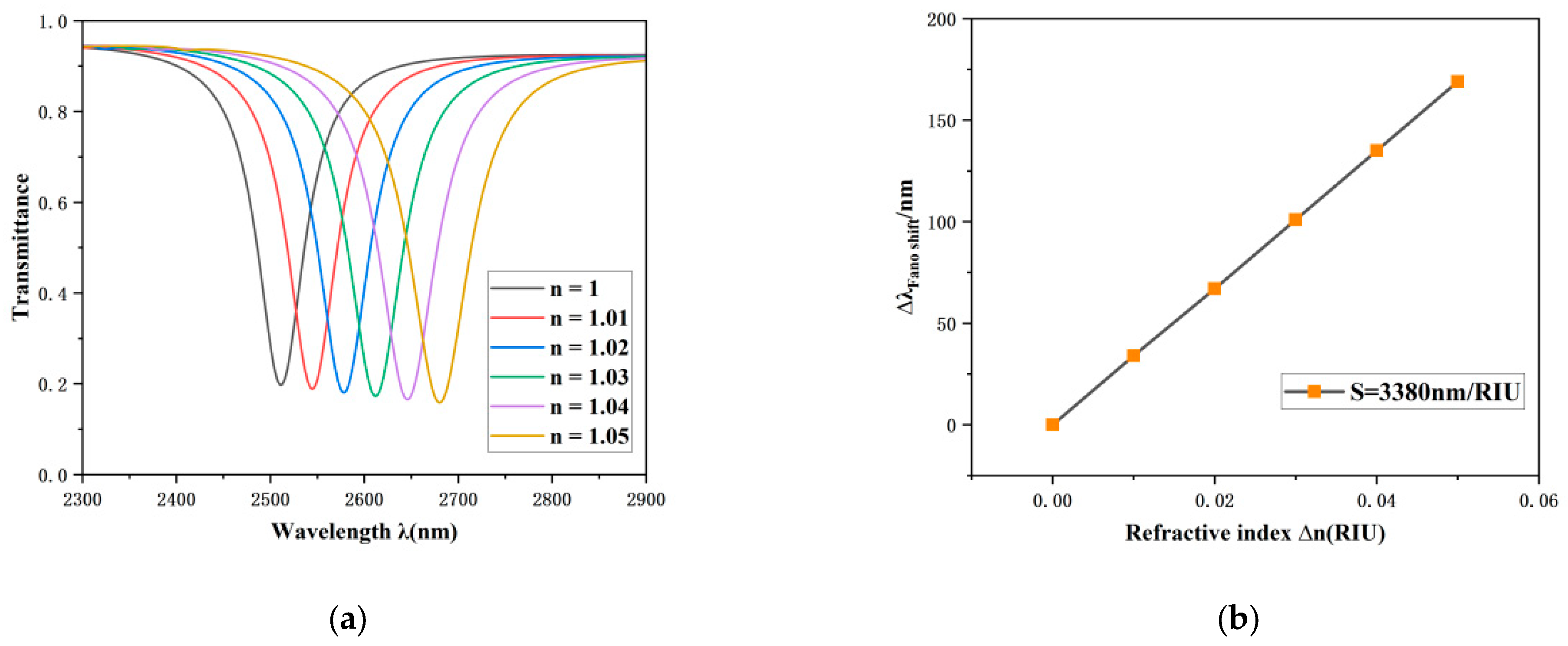 Figure 5a. The experimental findings reveal that with an increase in the refractive index, the Fano resonance curve exhibits a pronounced red shift phenomenon. Moreover, the sensitivity of the sensing system can be quantitatively assessed through the shift in the resonance dip. As depicted in