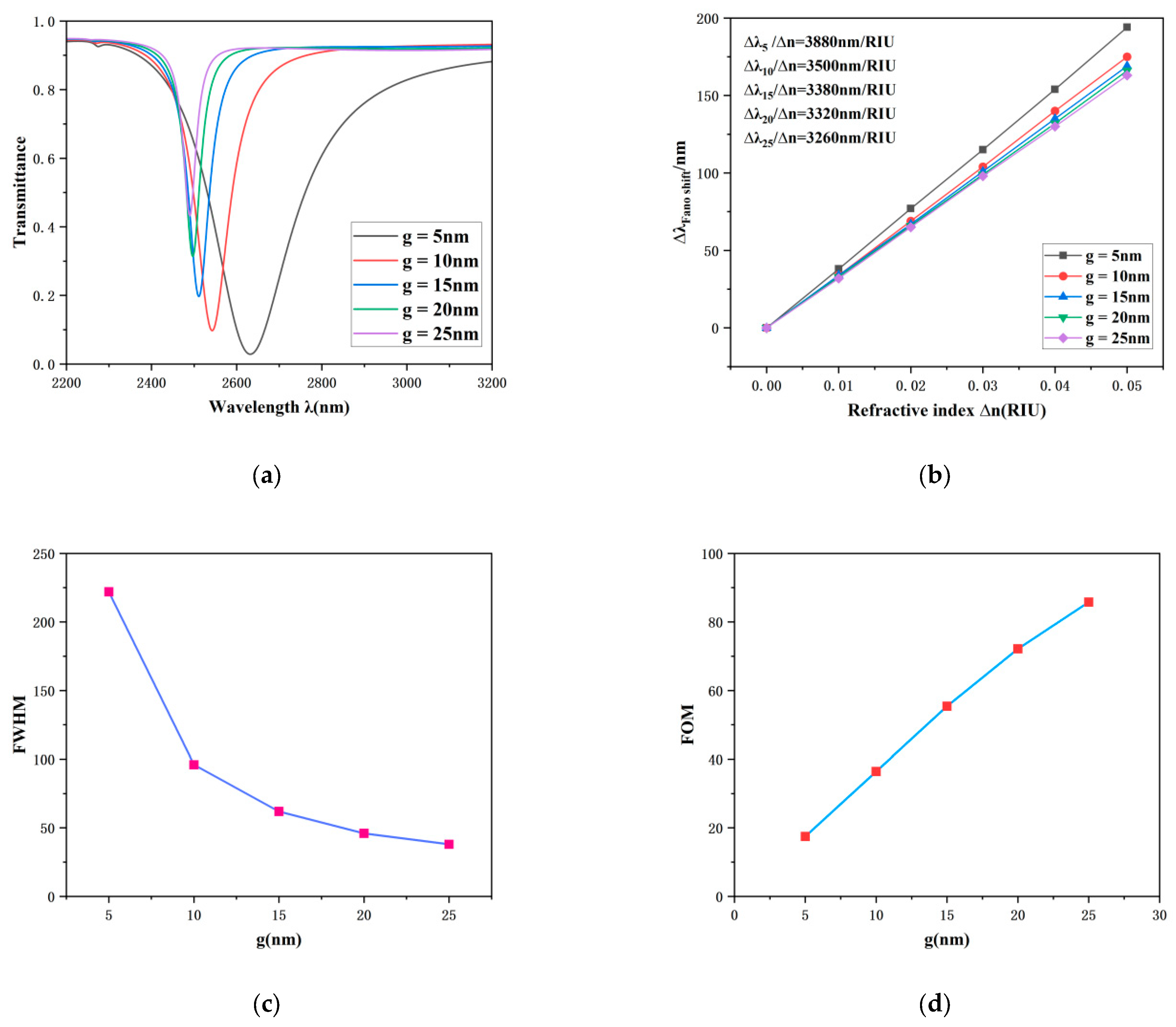 g from 5 nm to 25 nm, the sensitivity fluctuates within a limited range between 3260 nm/RIU and 3880 nm/RIU, suggesting that the coupling distance has a relatively weak influence on sensitivity. In contrast, the FOM undergoes a substantial change: as depicted in