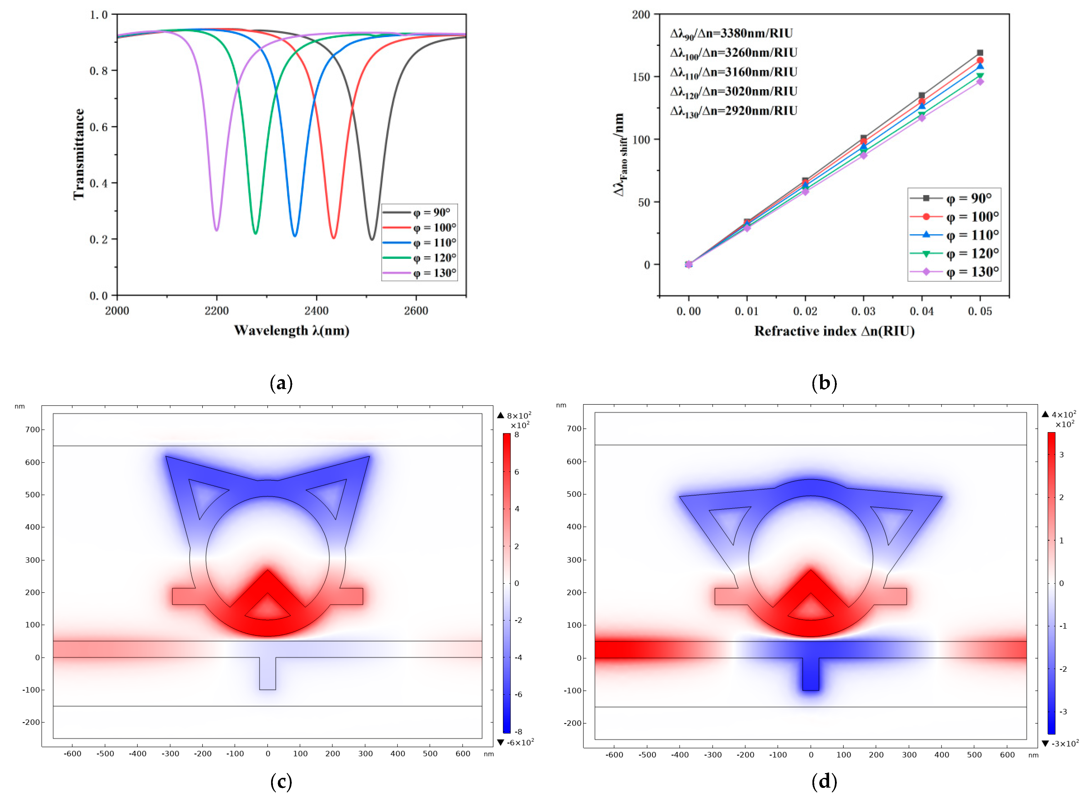 These results indicate that the angle φ is a critical geometric parameter for optimizing the optical performance of the TCRSW structure. In practical device design and integration, a suitable φ value can be determined considering the trade-off between spatial layout constraints and sensitivity requirements. This enables the optimization of spatial utilization efficiency while ensuring sensing accuracy, providing an effective design basis for realizing high-performance plasmonic sensing structures.
