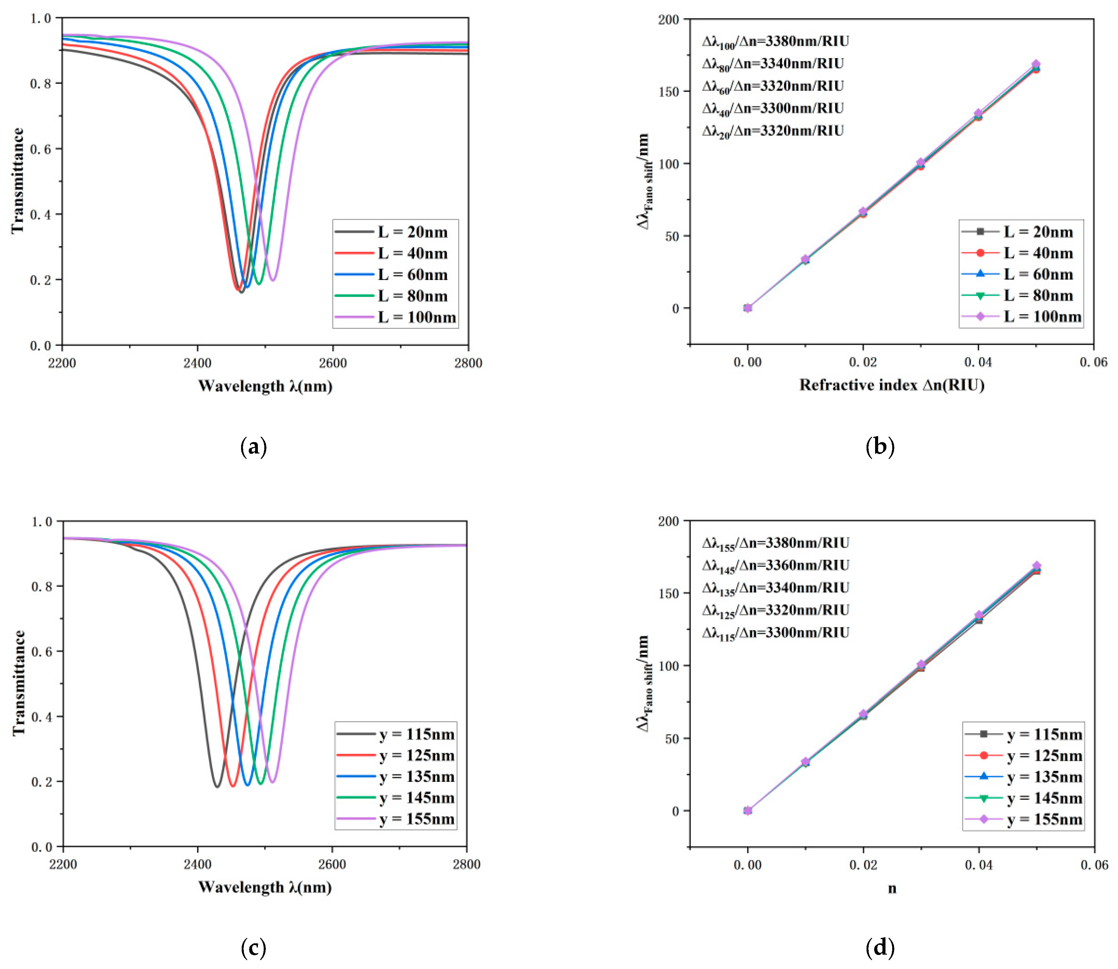 L is varied from 20 nm to 100 nm. As shown, the sensitivity transitions from 3320 nm/RIU to 3380 nm/RIU, and the transmission spectrum exhibits a red shift phenomenon. However, no significant changes in sensitivity or FWHM are observed. Similarly,
