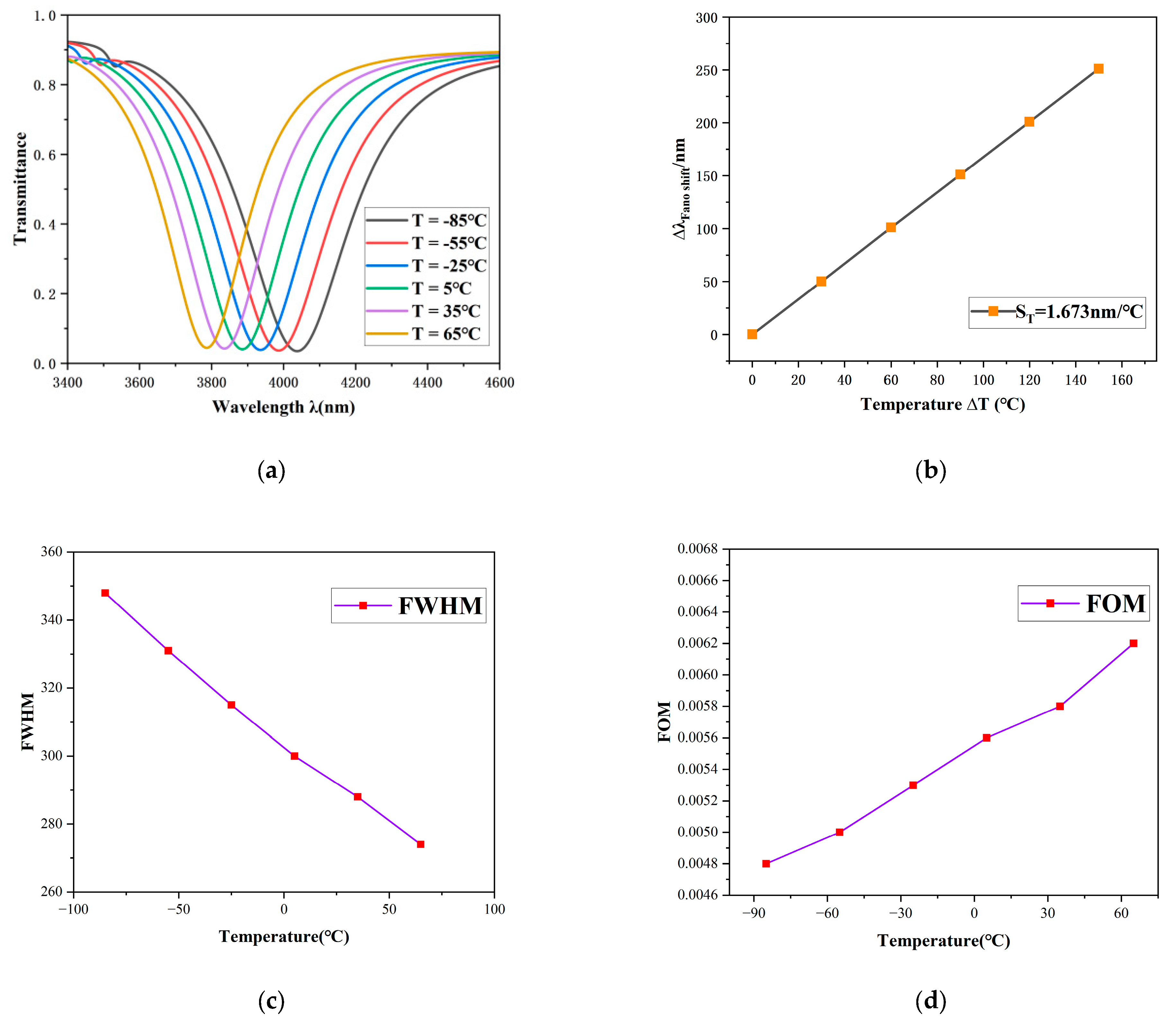 Figure 9c,d show the FWHM and FOM corresponding to the sensor system at different temperatures. As the temperature changes from −85 °C to 65 °C, the system’s resonant half-width (FWHM) varies from 348nm to 274nm and the optimum (FOM) changes from 0.0048 to 0.0062. Owing to its remarkable linear response and high sensitivity, this sensor possesses considerable practical value for precision temperature sensing.