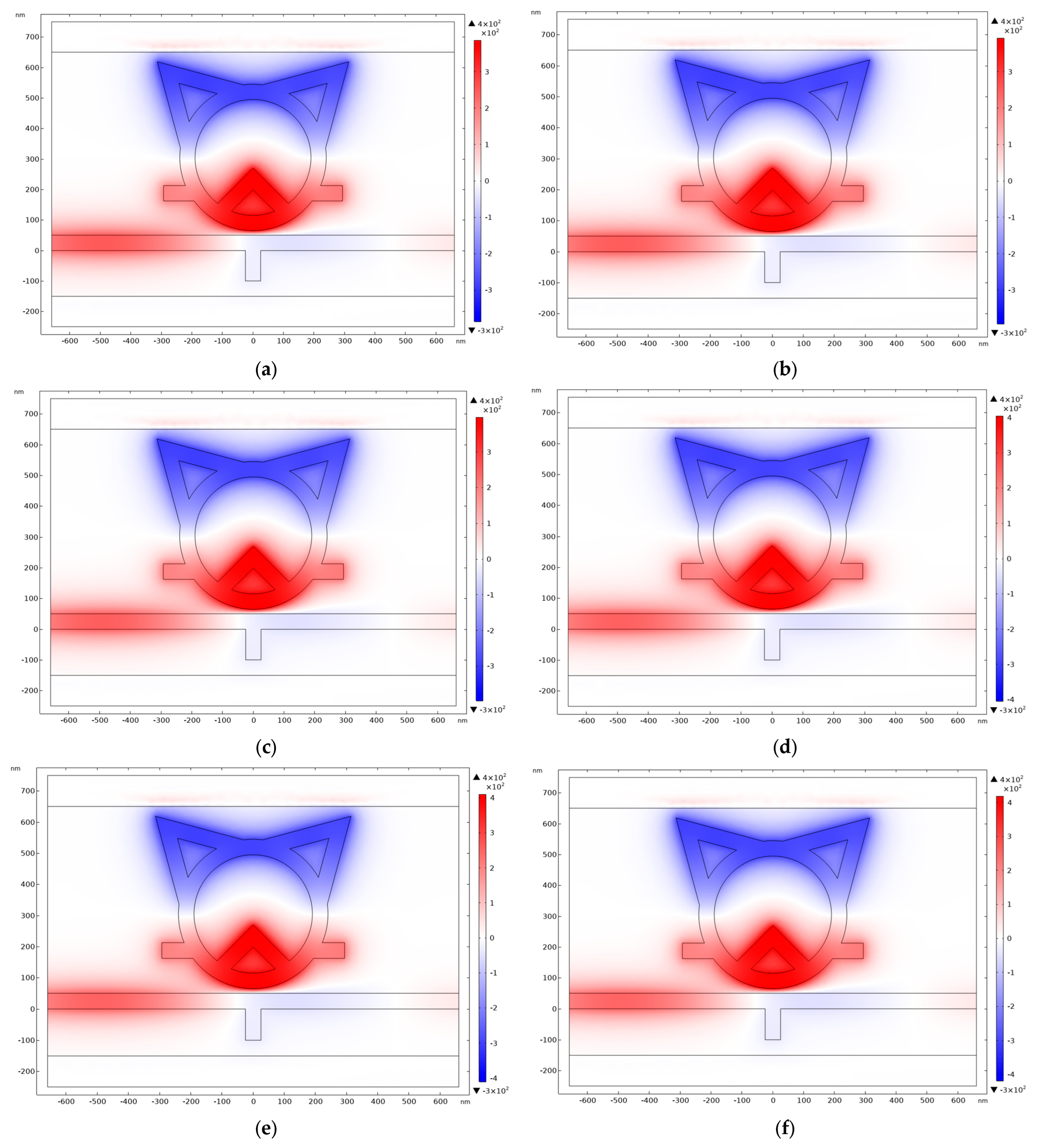 The finite element method was utilized for modeling and numerical simulations via the COMSOL Multiphysics 5.6 software platform. This software adeptly simulates the interactions between electromagnetic fields and matter in nanophotonic devices by solving coupled partial differential equations, rendering it particularly well-suited for modal analysis and numerical simulations that involve intricate multi-physics couplings.