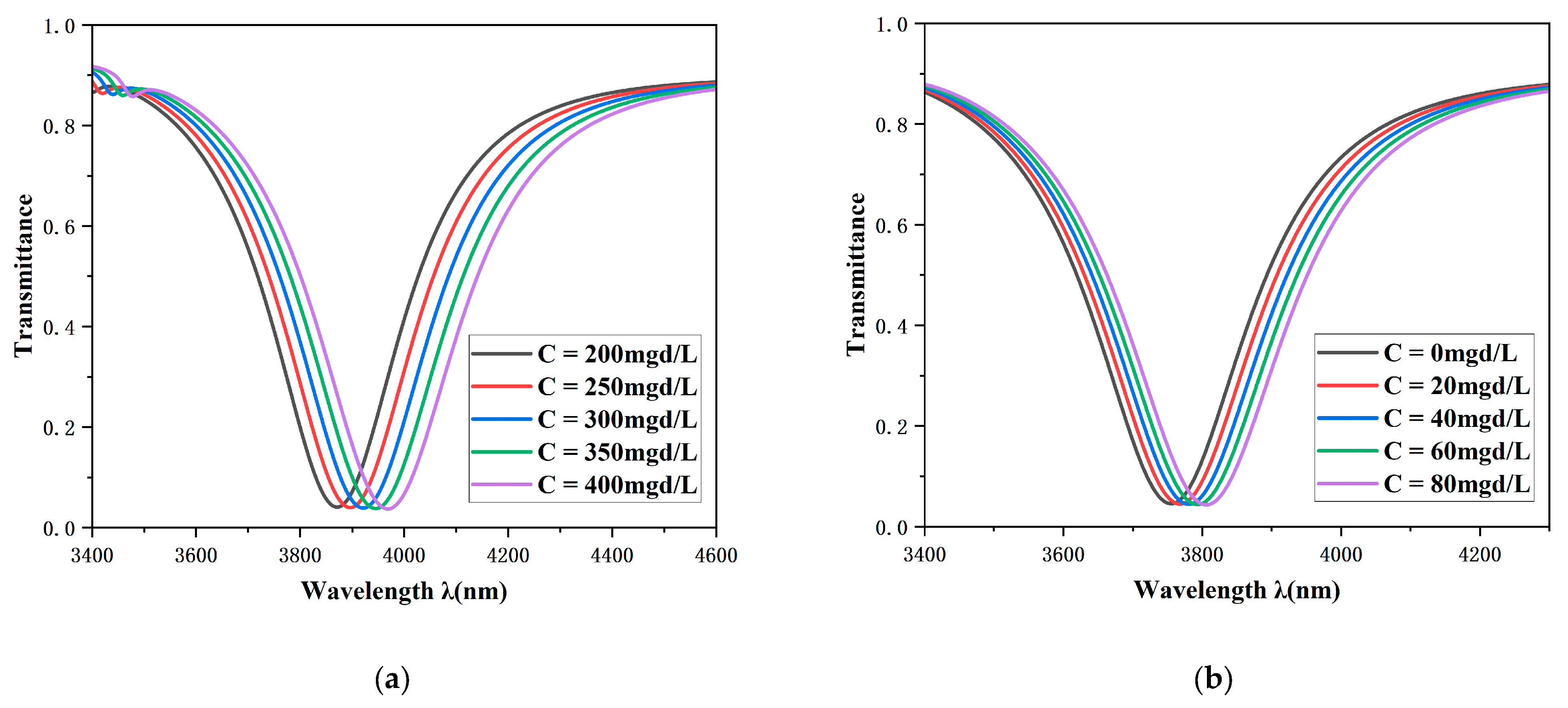 Figure 9a illustrates a significant blue shift in the transmission spectrum corresponding to an increase in temperature. The transmission dip shifts from 3787 nm to 4038 nm, corresponding to a total spectral shift (