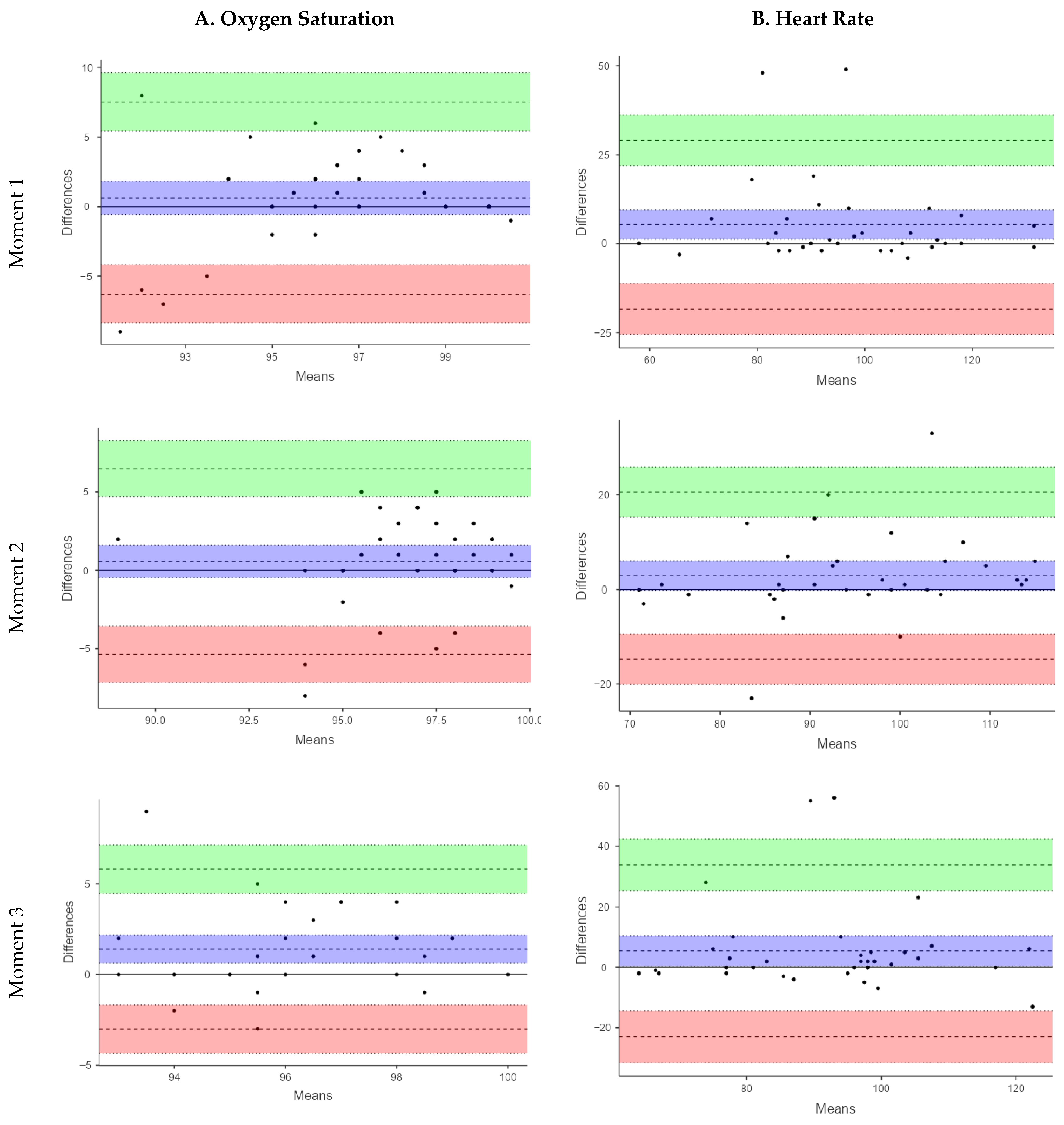 The ICC values for HR indicated a more acceptable level of agreement. At M1, moderate agreement was observed (ICC = 0.74; 95% CI: 0.54–0.85), which was similar at M3 (ICC = 0.58; 95% CI: 0.31–0.76), while good agreement was recorded at M2 (ICC = 0.76; 95% CI: 0.58–0.87). These findings suggest that, despite certain limitations, the smart band demonstrated greater validity for HR measurement than for SpO