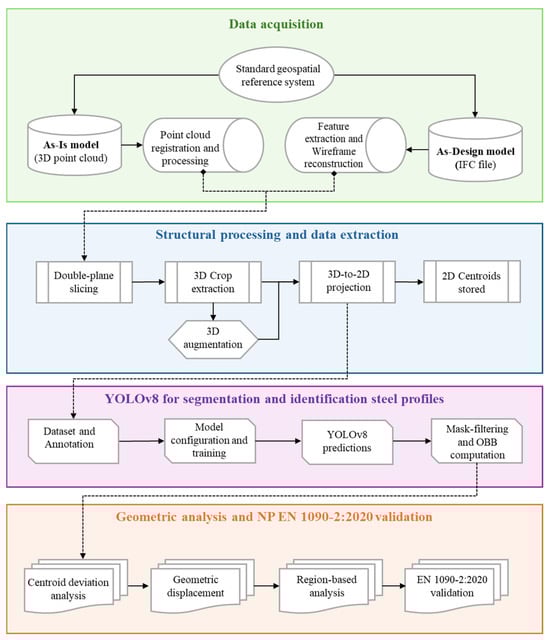 Figure 11 summarises the proposed automated workflow for geometric control of industrial steel structures. The process integrates multiple data sources and analytical modules into a continuous pipeline that links acquisition, processing, recognition and validation. The As-Is point cloud model and the As-Design information are jointly processed to generate a standardised 2D projection, enabling the YOLOv8 segmentation model to detect and classify structural cross-sections automatically. Rather than relying on direct estimation of sectional dimensions from point cloud geometry, the workflow establishes cross-sectional shapes through YOLOv8-based classification of standardised steel profiles.