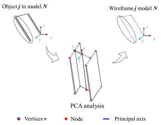 The As-Design data analysis process begins with the extraction of geometric and structural features from the IFC file describing the BIM asset. An algorithm processes the IFC data, extracting element information, including columns and beams, calculating precise endpoints, node coordinates, lengths and related metadata. Principal Component Analysis (PCA) [52] is then applied to determine the principal axis of each object in the model and compute its 3D node coordinates, as shown in Figure 4. Vertex coordinates are arranged in a matrix , containing each vertex’s normalised 3D spatial coordinates after mean subtraction. The covariance matrix is calculated to reveal the object orientation, as in (1).