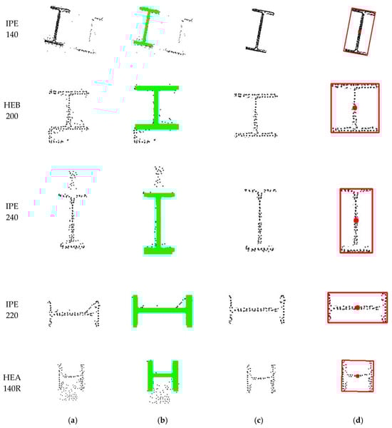 Example of the 3D data augmentation process applied to a synthetic HEA and IPE cross-sections: (a) clean projection of the original synthetic segment, (b) Gaussian noise and dropout augmentation, (c) synthetic profile insertion, (d) simulated cross-section duplication.