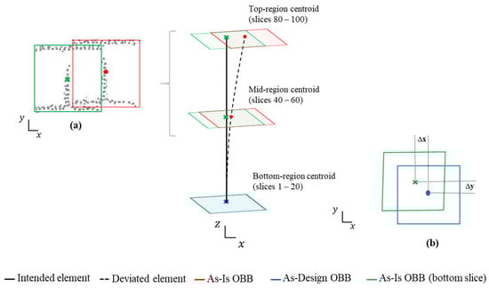 The analysis measures both translation displacements (Δx, Δy) between the As-Design reference centroid and the As-Is centroids. The validation process focuses on three distinct regions of each element: the Bottom (slices 1–20), the Mid (slices 40–60) and the Top (slices 80–100). These intervals cover structurally relevant sections and ensure spatial coverage and methodological robustness, even when data are incomplete or partially predicted. Figure 10 illustrates the two centroid-based measurement strategies defined for geometric validation following EN 1090-2:2020. Each criterion is assessed within predefined slice ranges corresponding to its geometric purpose: C1 uses strategy (b) on the bottom-region relative to its As-Design reference; C2-C5 use strategy (a), where C2 compares bottom and top centroids; C3 evaluates mid-span deviations along the element axis; C4 analyses left- and right-side elevations; and C5 examines mid-span within the element axis. The effectiveness of this strategy depends on accurate alignment between the As-Is and As-Design models.