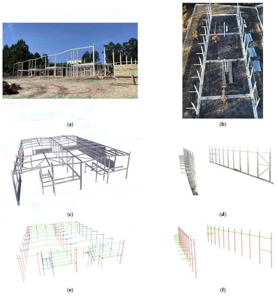The methodology was tested on two industrial steel assembly case studies located in Amarante and Maia (Porto district, Portugal), designated as Case I and Case II, respectively. Figure 12a,b illustrates the structural assembly stages during the surveys. Case I, evaluated at a more advanced execution phase, had all columns and most beams installed, supporting a comprehensive element-based validation. Case II, captured at an earlier phase of construction, with only columns and partial bracings, presented greater geometric complexity due to its inclined façades.