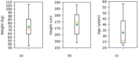 Box plots of demographic data for the 20 participants, along with the median (orange) and mean (green) values. (a) Weight; (b) height; (c) age.