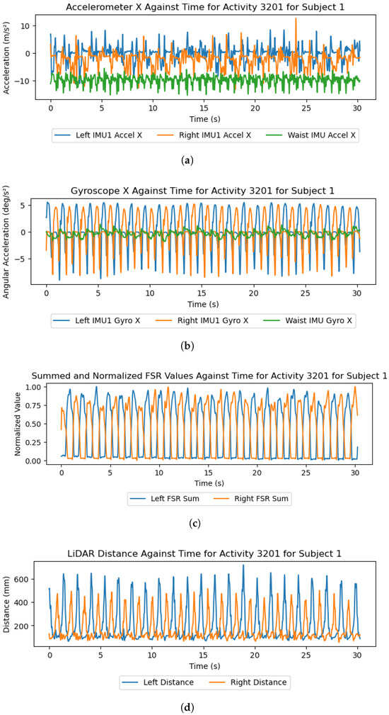A selection of graphs that plot the data from the IMU X axis, summed and normalized FSR values, and LiDAR distances from subject 1’s “3201.txt” file, filtered using a 4th-order Butterworth low-pass filter with a 10 Hz cut-off frequency. (a) IMU accelerometer X axis; (b) IMU gyroscope X axis; (c) normalized FSR values; (d) LiDAR distance.