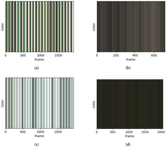 Color over time captured from the left leg during walking on 4 different flooring types. (a) Grass; (b) gravel; (c) asphalt; (d) laminated flooring.