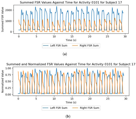 Plots of the insole data from the walking-on-grass trial of participant 17 when summed and normalized. The data is filtered using a 4th-order Butterworth low-pass filter with a 10 Hz cut-off frequency. (a) Summed; (b) summed and normalized.
