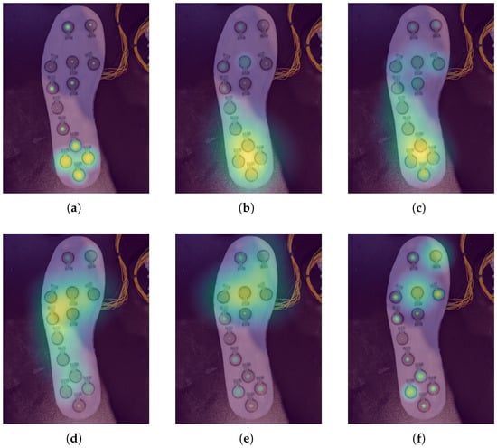 Heat maps of the FSR data 160 ms apart during subject 1’s walking-on-carpet trial. (a) 480 ms; (b) 640 ms; (c) 800 ms; (d) 960 ms; (e) 1120 ms; (f) 1280 ms.