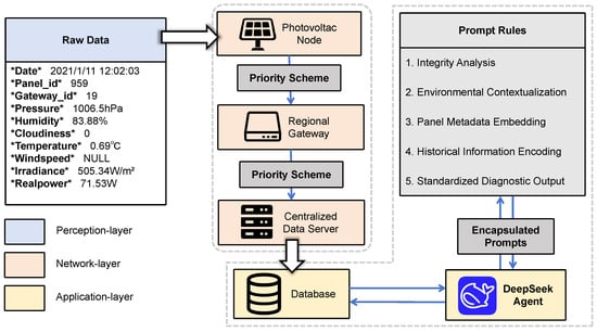 The proposed DPV monitoring system consists of three layers. At the perception layer, various sensors detect the status of photovoltaic nodes. At the network layer, operational data from monitoring devices in the perception layer is transmitted through regional gateways according to the priority scheme, ultimately reaching the centralised data server. At the application layer, the Deepseek Agent (https://api-docs.deepseek.com/zh-cn/api/deepseek-api/, accessed on 25 December 2025) encapsulates prompts according to specific prompt rules and performs fault diagnosis on database data.
