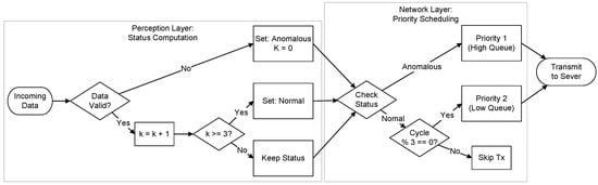 To summarize the interaction between these components, the complete algorithmic workflow is visualized in Figure 4. This formal block diagram explicitly maps the data flow from signal acquisition to transmission, illustrating the control dependencies between the perception-layer hysteresis counter (k) and the network-layer scheduling decision. As depicted, the timing of transmission events is strictly coupled to the derived status, ensuring that network resources are dynamically allocated based on the semantic urgency of the data.