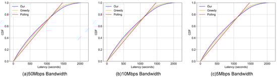 To ensure a fair and rigorous comparison, all three scheduling schemes were evaluated under identical, controlled simulation conditions. The simulation was configured to commence at a virtual time of 12:00:00 on 11 January 2021, and run for a simulated duration of one hour. To ensure a controlled evaluation environment, key network and data parameters are held constant across all experiments. The uplink transmission rate for each photovoltaic node is configured to 13.1 kbps. Crucially, each photovoltaic data packet is set to a uniform fixed size of 440 bits, regardless of whether the payload contains normal telemetry or anomalous fault signatures. This uniformity mirrors the fixed-frame structure of standard industrial protocols (e.g., Modbus) and ensures that any observed performance differentiation is driven strictly by the scheduling logic rather than variations in transmission serialization time. To assess performance under varying network constraints, the simulations were replicated across three distinct gateway uplink bandwidth settings: 50 Mbps, 10 Mbps, and 5 Mbps. The results of this comparative evaluation are presented in the following section.