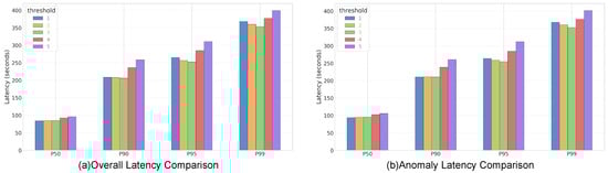 Parameter sensitivity analysis of the recovery threshold (K) under a 10 Mbps bandwidth constraint. (a) Comparison of Overall Latency across different percentiles. (b) Comparison of Anomaly-specific Latency.