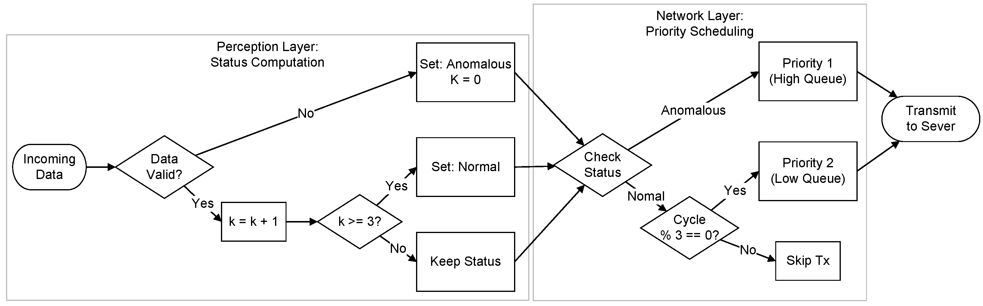 - We introduce a priority-based scheduling strategy that fundamentally differs from standard MAC-layer Quality of Service (QoS) or edge-offloading frameworks. While traditional methods focus on reordering packets after they have been queued, namely congestion management, our algorithm implements source-side traffic shaping. By dynamically suppressing the data generation of normal nodes based on their semantic status, the system preemptively prevents bandwidth saturation, achieving a 46.08% to 49.87% reduction in P50 latency for critical data in bandwidth-constrained scenarios.