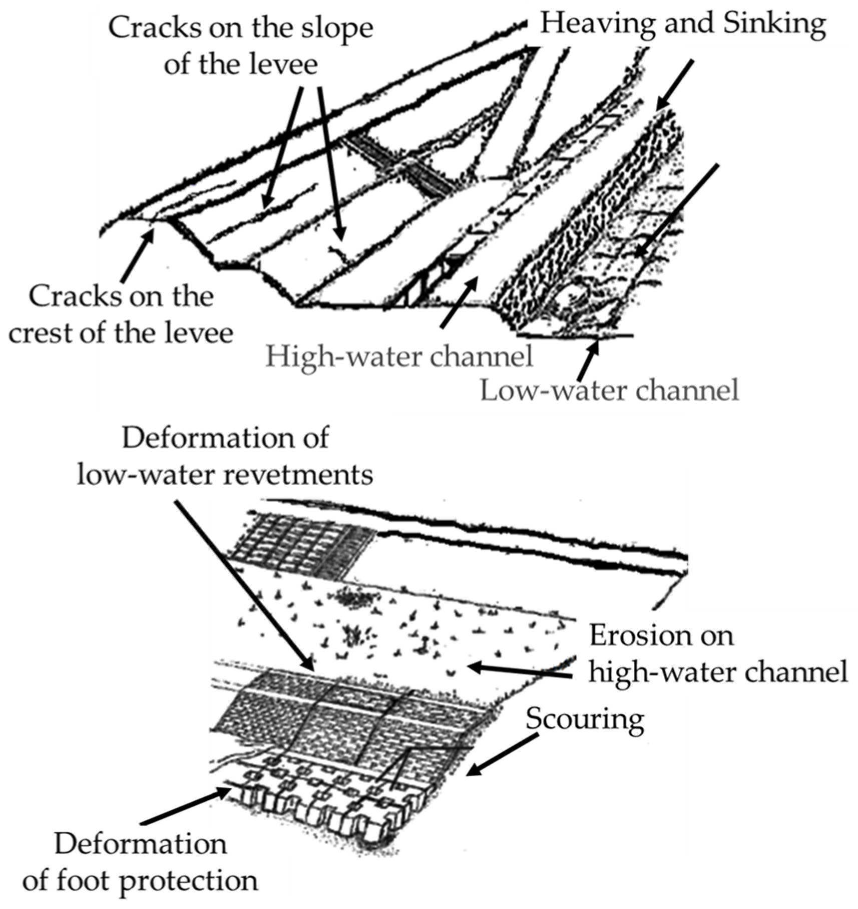 - Deformation of the low-water revetment causes lateral erosion of the high-water bank because of progressive destruction due to fluid forces. Erosion of the floodplain also leads to the risk of the embankment itself becoming destroyed by erosion. Therefore, structural deformation that can lead to lateral erosion of the levee slopes, as shown in the bottom part of Figure 1, requires quantitative evaluation of the location, size, and progression of the deformation.