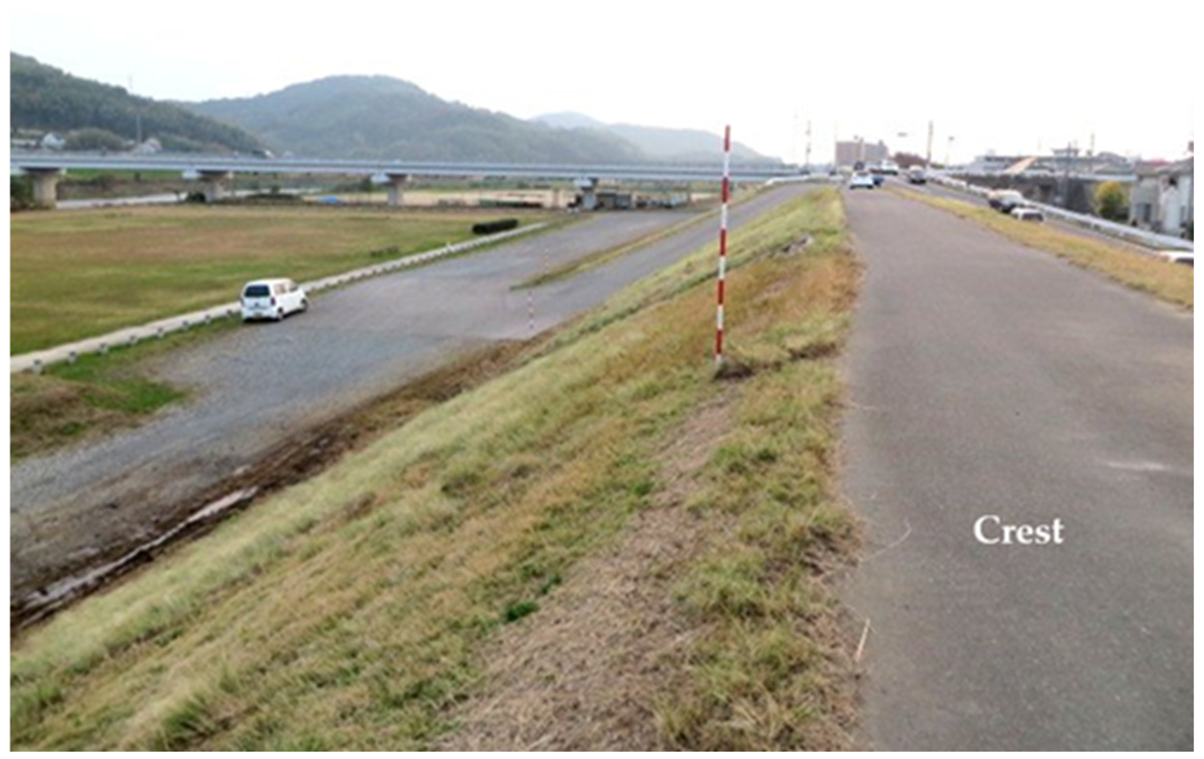 - Cracks on the crest or slope of a levee may indicate the formation of a sliding surface on the levee. If left unchecked, the levee will lose its shear resistance when the seepage surface inside the levee rises, resulting in crack expansion and sliding failure. Therefore, it is important not to overlook deformations that accompany crack expansion. The top part of Figure 1 is an example of deformation that can lead to levee failure.