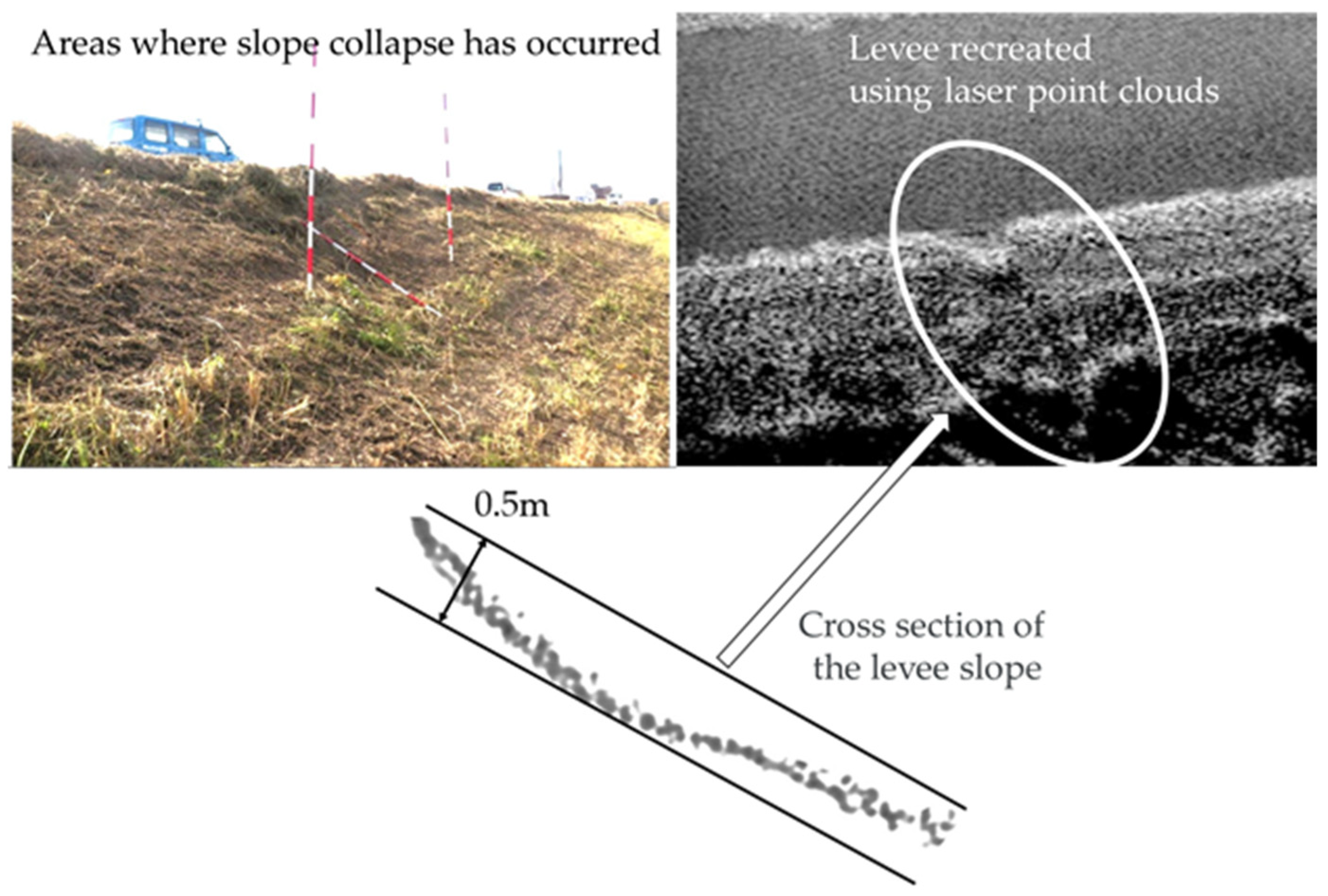 - Akiyama, N.; Nishiyama, S.; Sakita, K.; Song, J.; Yamazaki, F. River Levees Monitoring Using Three Dimensional Laser Point Clouds with SLAM Technology. In Advancements in Geotechnical Engineering; Sustainable Civil Infrastructures; Springer: Cham, Switzerland, 2021; pp. 14–22. [Google Scholar]