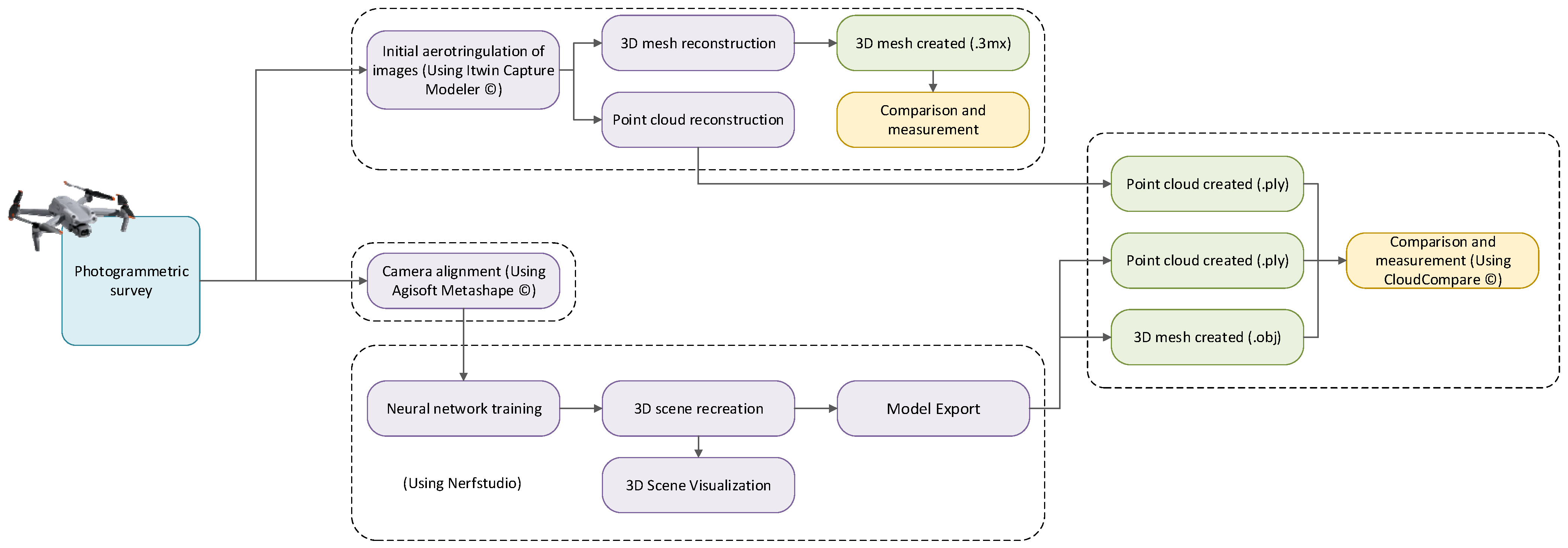 To ensure replicability and comparability across technologies, a dual processing workflow was established: one for NeRF-based modeling and the other for digital photogrammetry. The complete methodology is summarized in