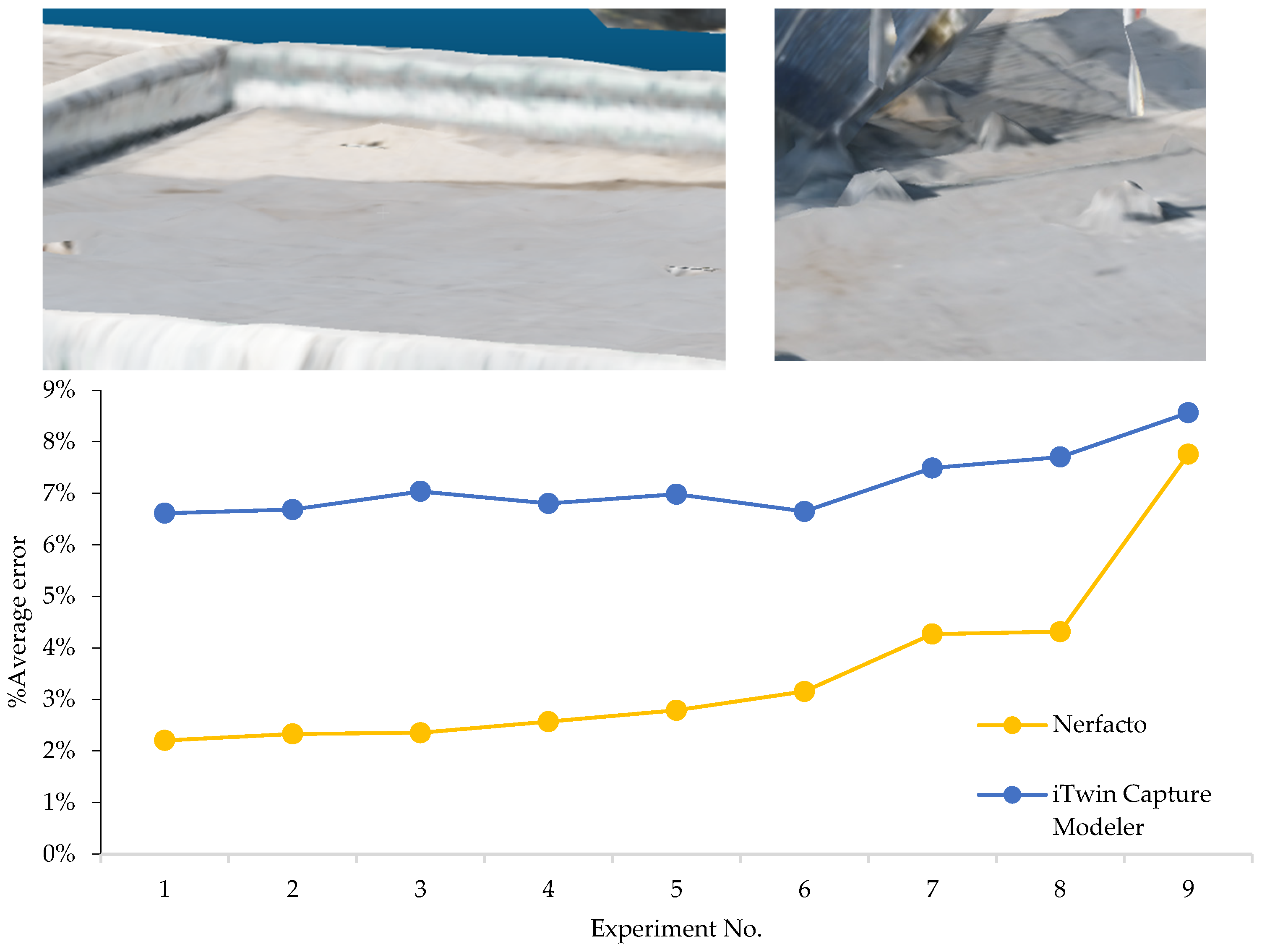 Figure 6, which shows error trends for both methods as image count decreases. As expected, both technologies show increased error with fewer images. iTwin Capture Modeler errors grow steadily, while Nerfacto’s accuracy declines more sharply but remains lower overall in most experiments. Interestingly, Nerfacto achieves better metric precision than photogrammetry even in Experiment 8, despite its visually lower-quality mesh. These findings suggest that while Nerfacto struggles with geometric completeness and detail, it retains proportional consistency across scales, making it potentially useful for certain engineering scenarios—especially under limited data conditions. Further research under controlled and optimized acquisition settings may reveal whether NeRF-based methods can improve both accuracy and detail in tandem.