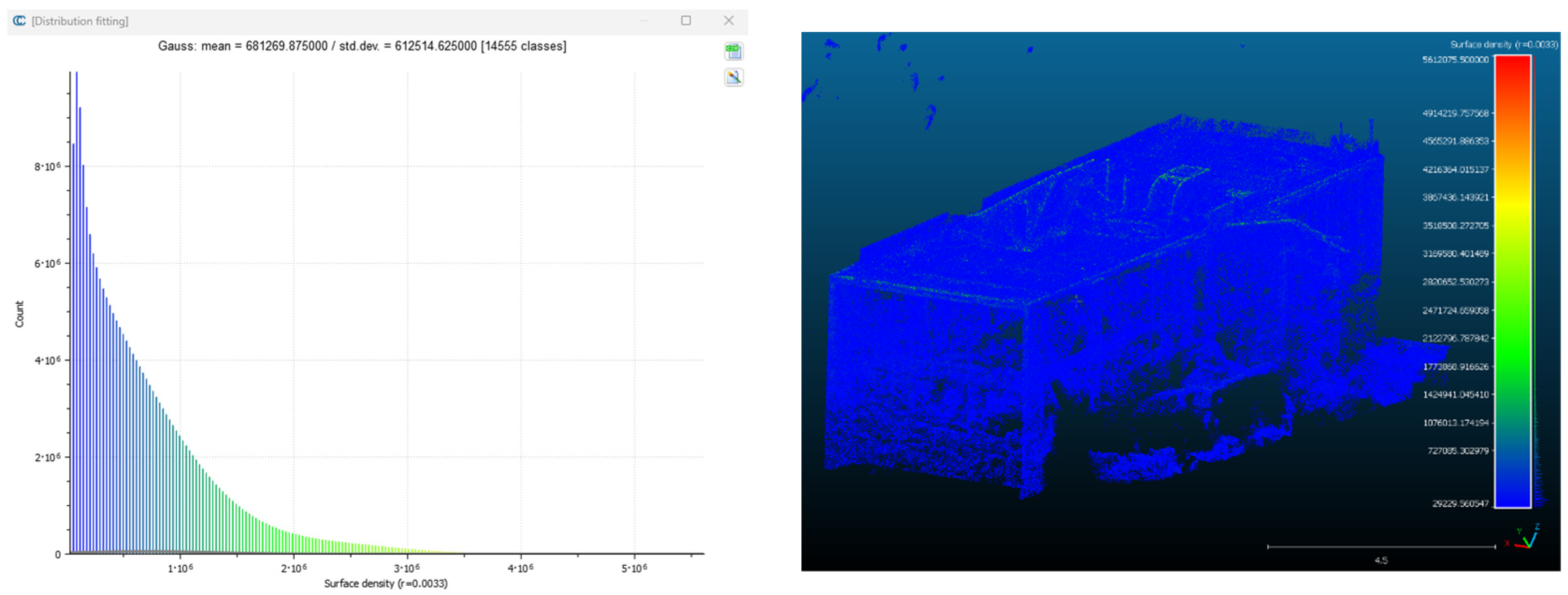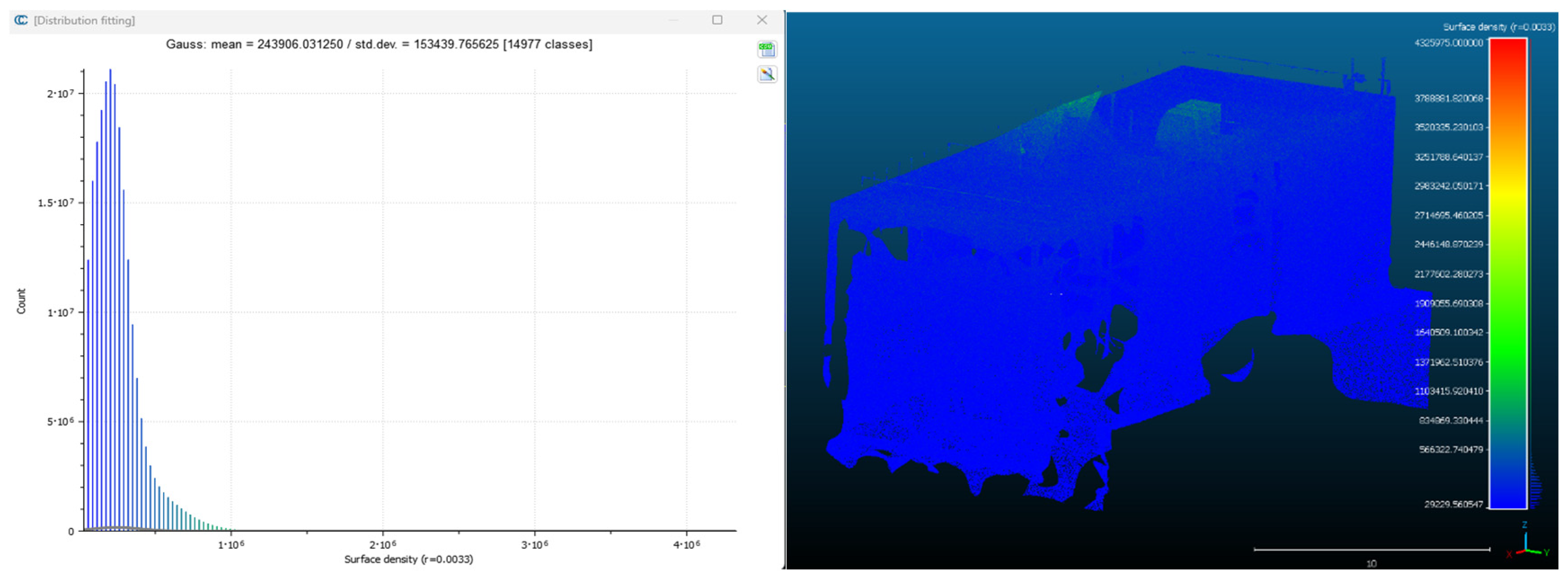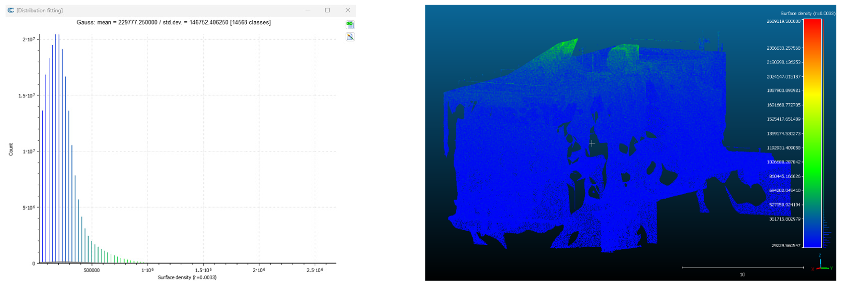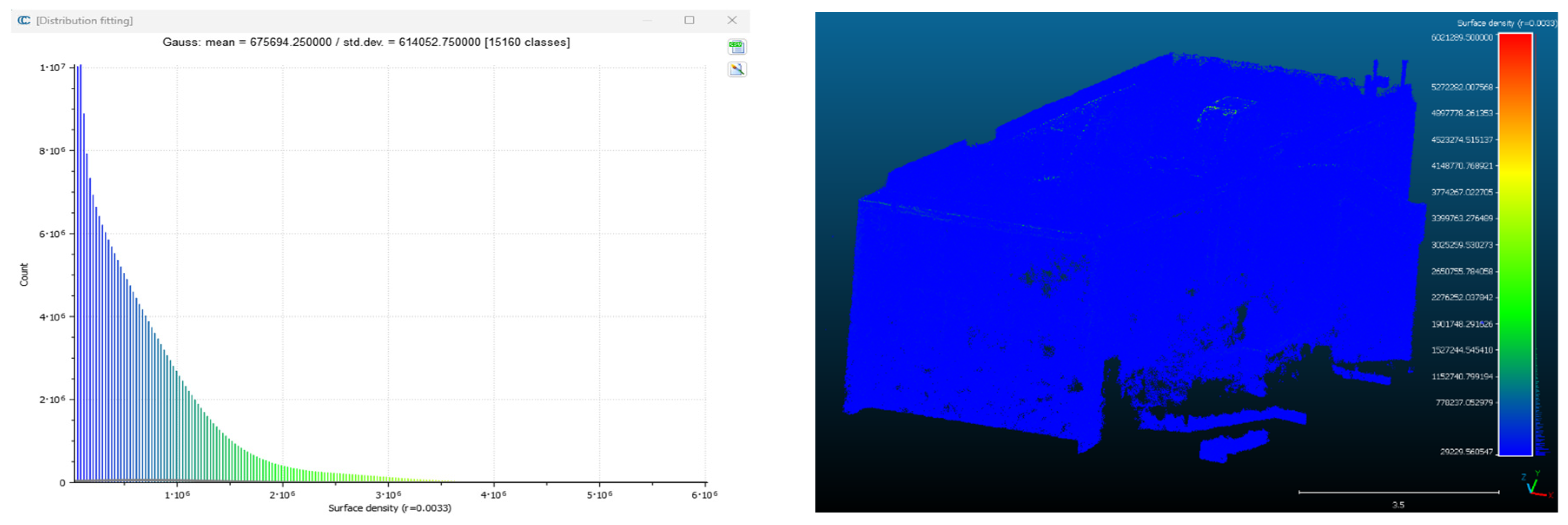 Point cloud density was also analyzed using CloudCompare by applying a constant local neighborhood radius of 0.0033 across all models—selected as the average of the software’s suggested values to ensure comparability.