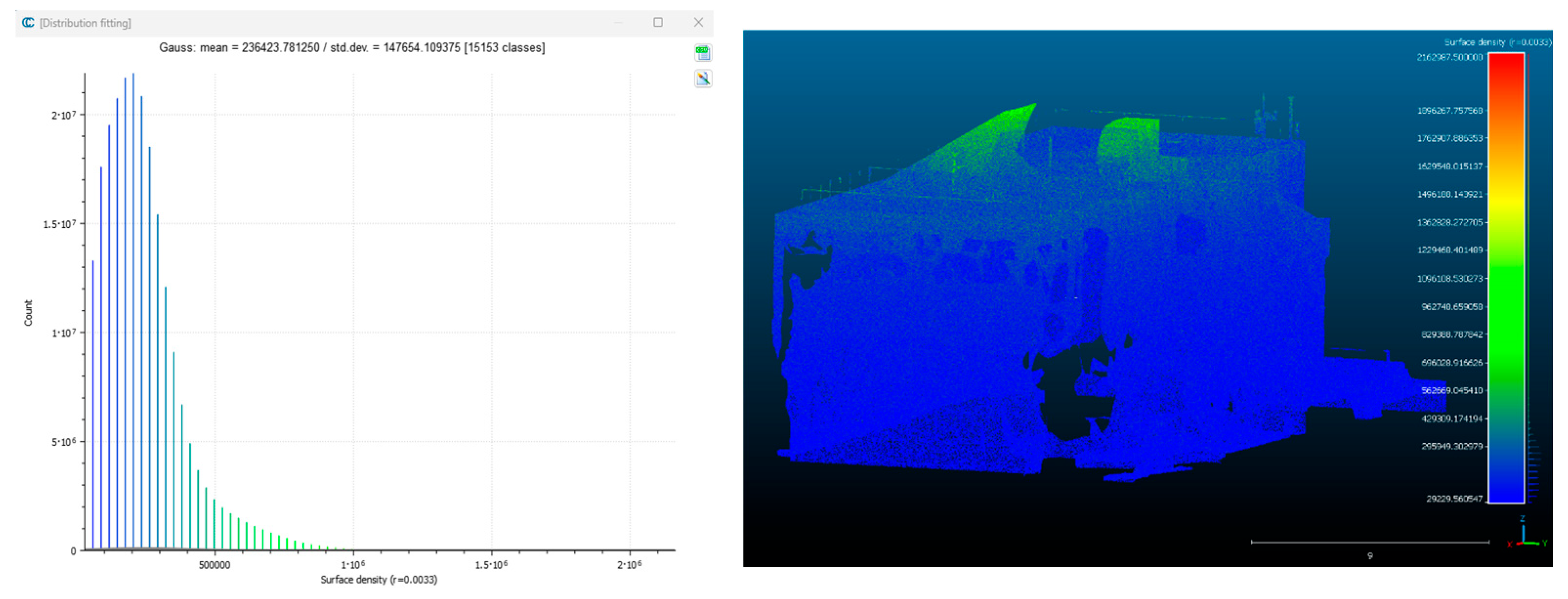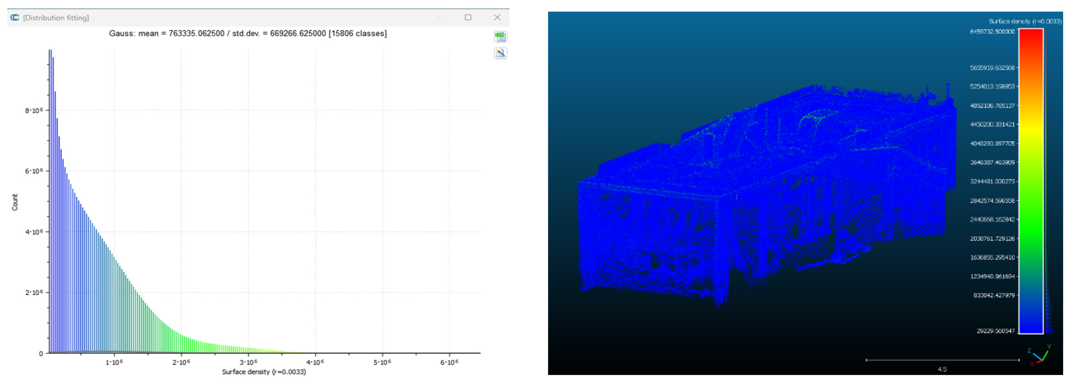 To assess the geometric reliability of the 3D reconstructions generated by both technologies, a quantitative analysis of point cloud density and spatial consistency was conducted using CloudCompare. After exporting all point clouds, the local point densities were calculated by applying a uniform Local Neighborhood Radius of 0.0033, a value determined as the average of the radii automatically suggested by the software for each model. This standardized radius allowed for fair inter-comparison across the experiments, despite variations in scale and model volume—particularly relevant in the case of NeRF exports, which lack absolute scale by default.