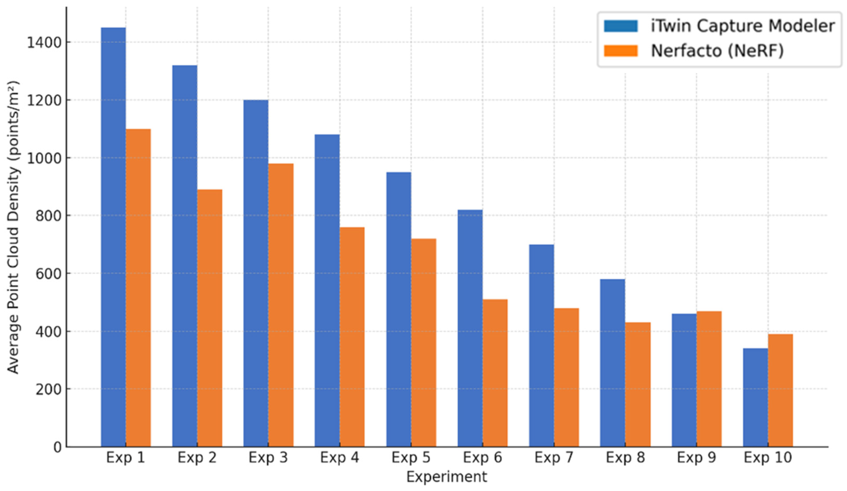 Figure 13, which displays the average points per square meter for each technology across the ten experiments. This allows a comprehensive understanding of performance without the need to examine each individual case visually. This graph illustrates a clear, progressively decreasing trend in point cloud density for iTwin Capture Modeler as image count is reduced—consistent with expected photogrammetric behavior. In contrast, Nerfacto exhibits irregular and non-monotonic fluctuations in density, suggesting instability in model generation under limited data conditions. This variability may result from incomplete scene coverage, uneven point distribution, and geometry inference errors inherent to NeRF when trained with reduced datasets.