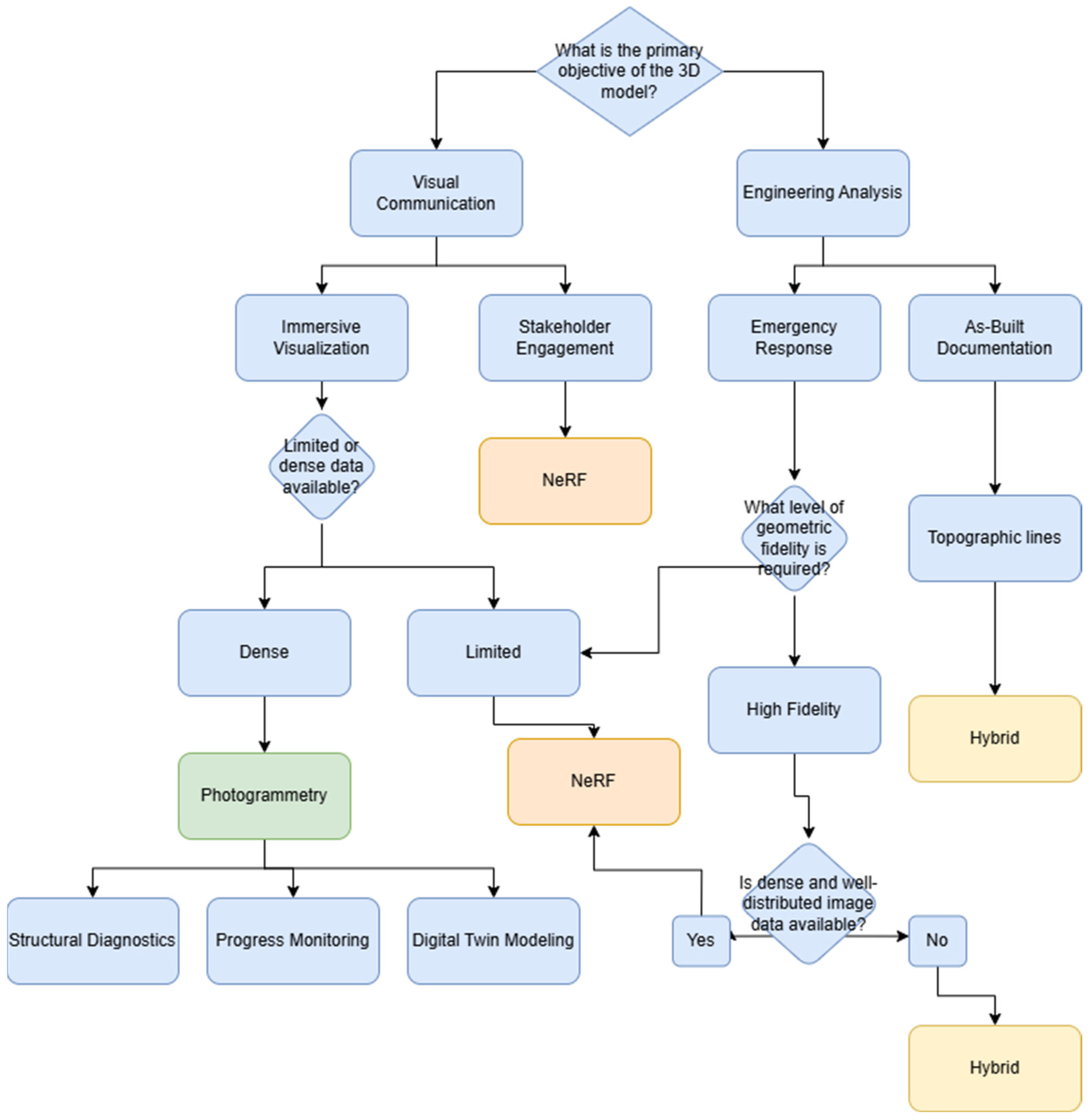 On the engineering analysis side, the flow addresses more technical and precision-dependent scenarios such as emergency response and as-built documentation. The user is then asked whether hybrid or photogrammetry-based modeling is preferred. If high metric accuracy is required and sufficient image coverage is available, photogrammetry is advised for tasks like structural diagnostics and topographic surveys. If flexibility or partial modeling is acceptable due to environmental constraints, a hybrid workflow is recommended, combining NeRF for fast visualization with photogrammetry applied selectively to key structural elements.