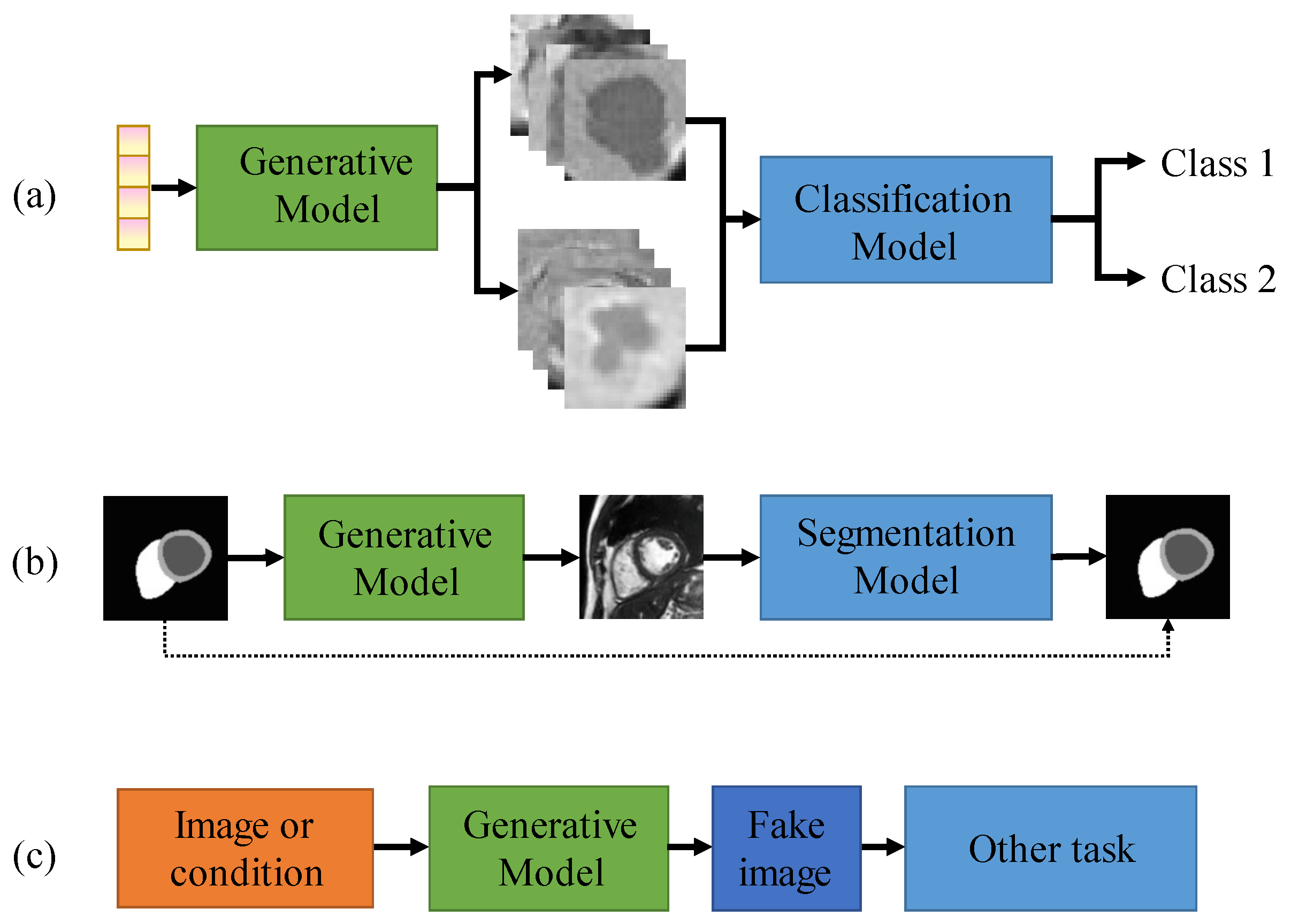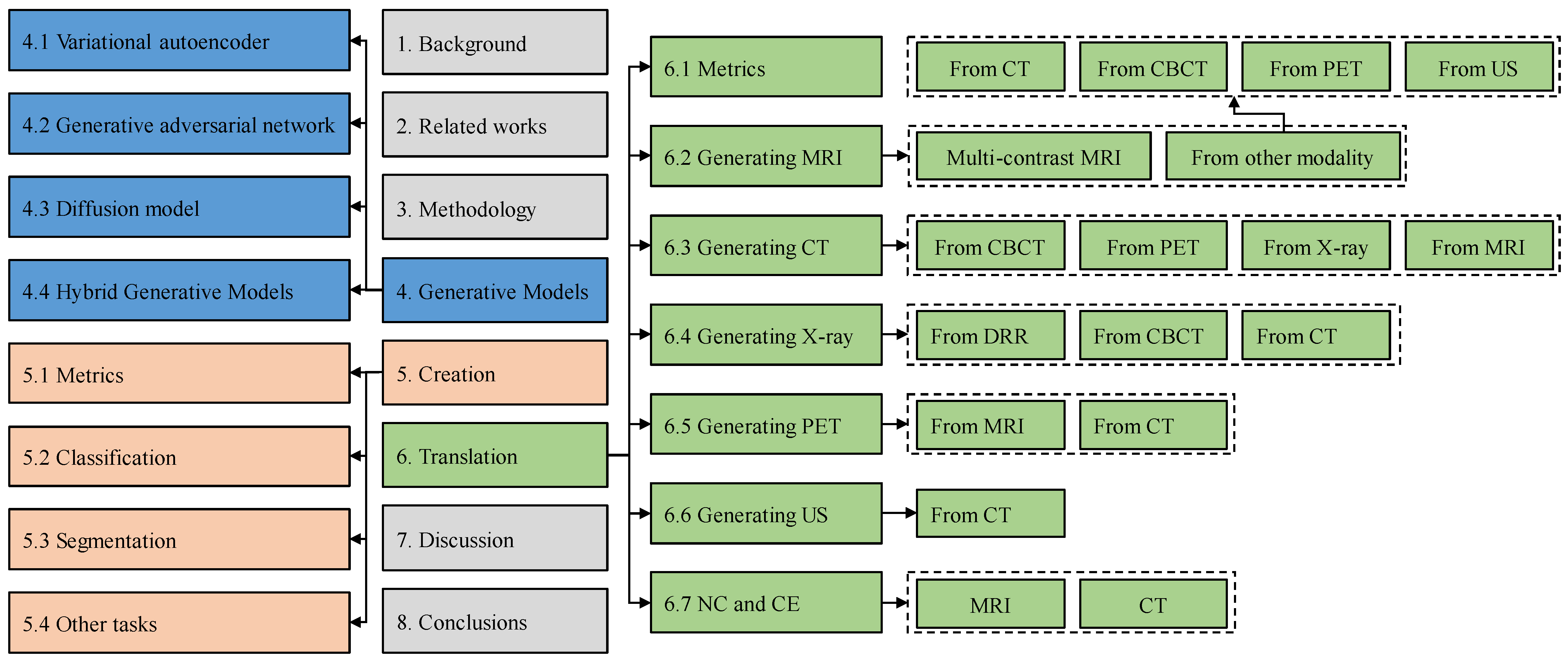 - This review categorizes the applications of generative models in medical image analysis into creation and translation. We present an extensive review of creation methods and classify their downstream applications into three distinct categories: classification, segmentation, and others. We classify translation methods based on the target modality.