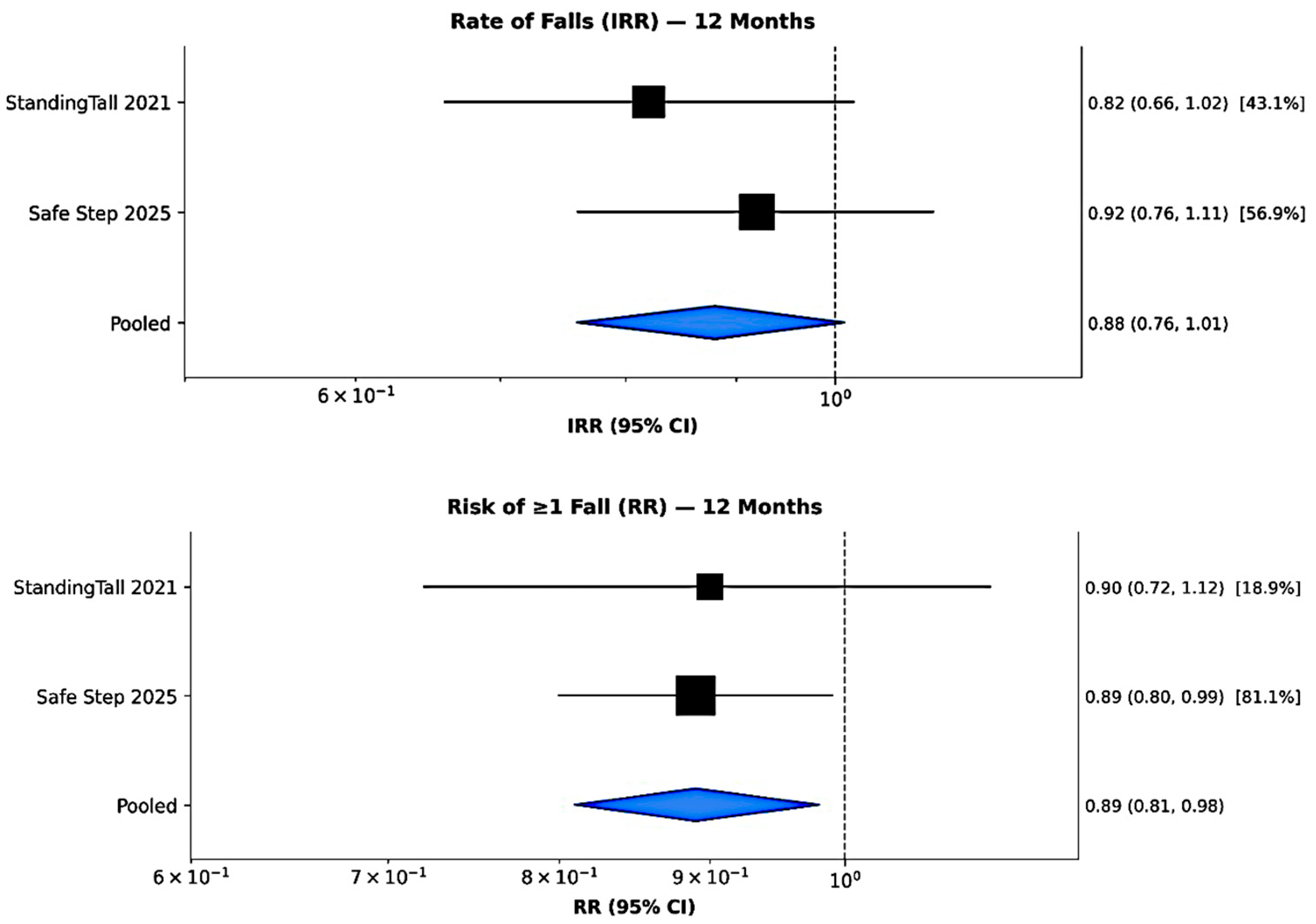 | Safe Step (Pettersson et al., 2025) [4] | Sweden | 1628 | 1628 | 75.8 (4.4) | 79% | Community-dwelling age ≥70, recent fall/balance decline | Digital exercise app + monthly educational videos | Educational videos alone | 12 months | Fall rate (IRR), ≥1 fall (RR) | 12 months |