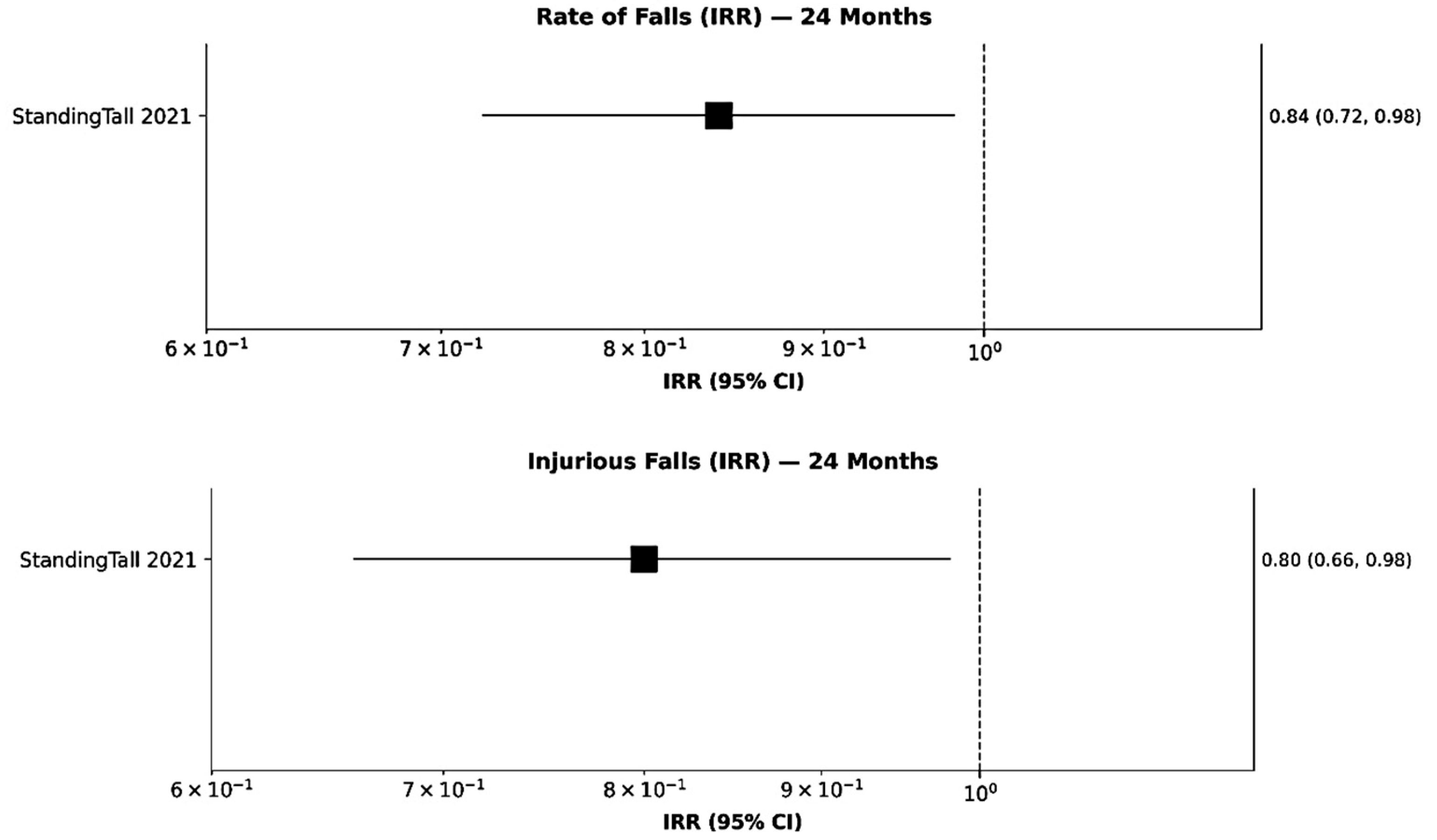 | StandingTall (Delbaere et al., 2021) [1] | Australia | 503 | 503 | 75.4 (4.2) | 67% | Community-dwelling, high fall risk | Self-managed balance exercise app with video feedback | Educational videos only | 24 months | Fall rate (IRR), ≥1 fall (RR), injurious falls | 12 and 24 months |
