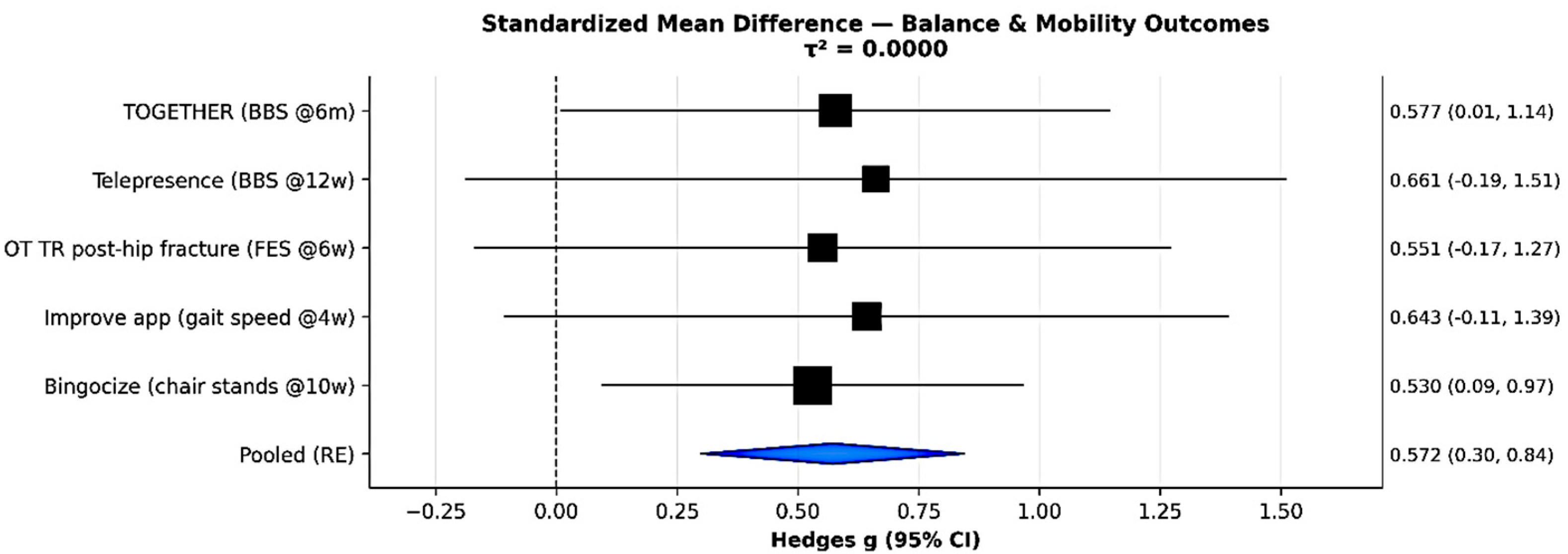 | TOGETHER (Hawley-Hague et al., 2023) [11] | UK | 50 | Self-managed app + gamification | Real-time supervised | Exercise + Behavioral support | Usual care | 6 months | Falls, balance (BBS), strength, fear of falling | 6 months |