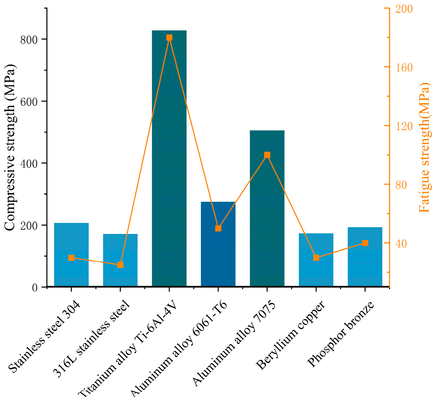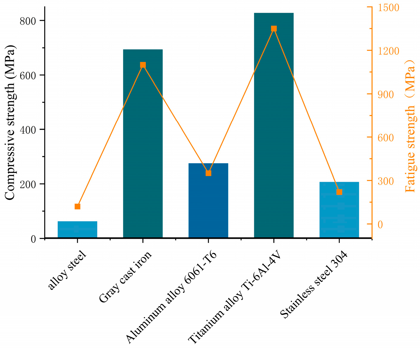 The components of the device, excluding the strain block, can be regarded as the casing, which provides mechanical support and protection for the strain block. The casing material was selected through a comparative analysis of commonly used metallic materials. As shown in Figure 4, gray cast iron exhibits a compressive strength of 693 MPa, whereas the titanium alloy reaches 827 MPa, both demonstrating relatively high strength. Aluminum alloy and stainless steel show moderate compressive strength, whereas alloy steel exhibits the lowest strength. The fatigue strength of these materials also shows a proportional relationship with compressive strength.
