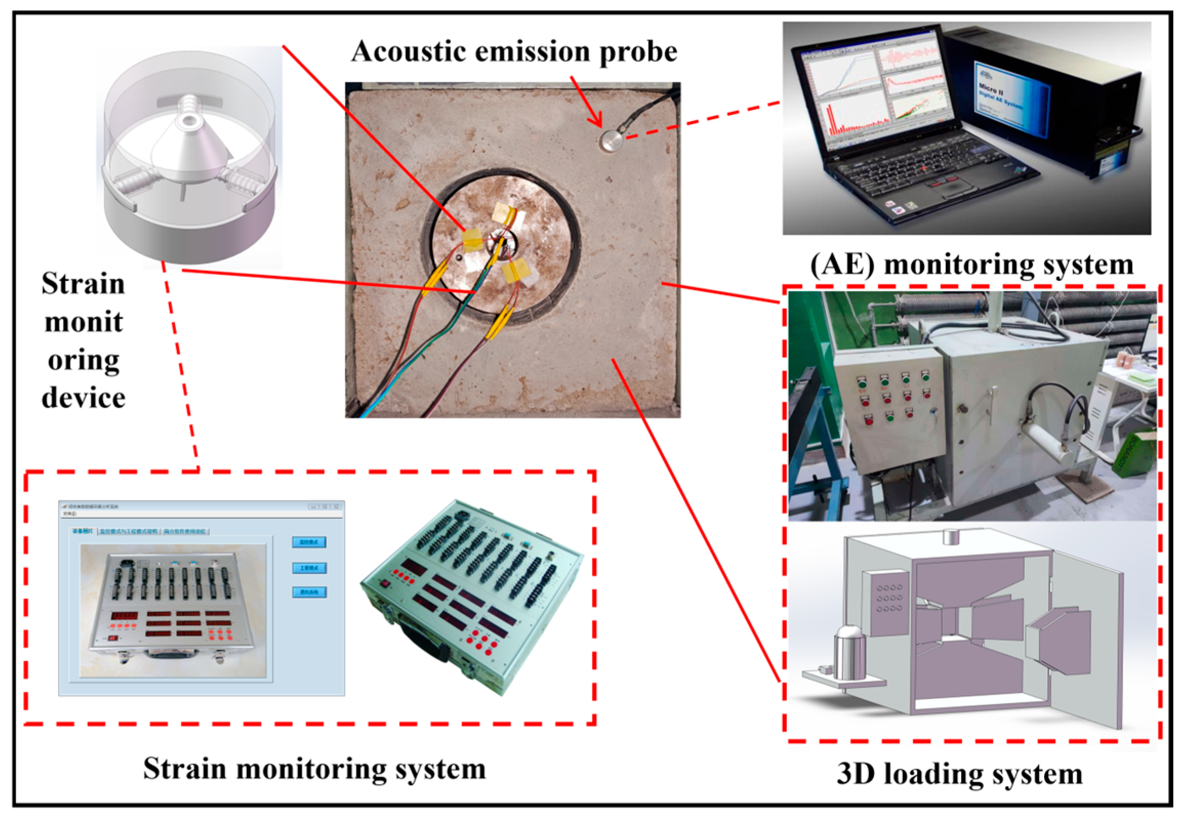 After the tests were completed, strain data were collected and converted into applied stress values using the corresponding calculation formulas. The inverted stress values were then compared with the data obtained from the loading system and the acoustic emission monitoring system. These results were used to evaluate the monitoring accuracy and practicality of the stress monitoring device under complex stress conditions, thereby verifying its feasibility for application in simulated roadway surrounding rock stress environments. The data acquisition system operates in a continuous sampling mode to achieve real-time, second-level monitoring of stress evolution in the surrounding rock. The selected sampling frequency is sufficient to continuously capture the key stages of stress evolution during deep mining, including stress loading, concentration, unloading, and redistribution. It should be noted that the term “real-time” in this study refers to the continuous and synchronous acquisition of stress evolution processes, rather than millisecond-level responses to instantaneous microcrack propagation. The monitoring objective, therefore, focuses on the macroscopic evolution and concentration characteristics of mining-induced stress. The experimental system is shown in Figure 5.